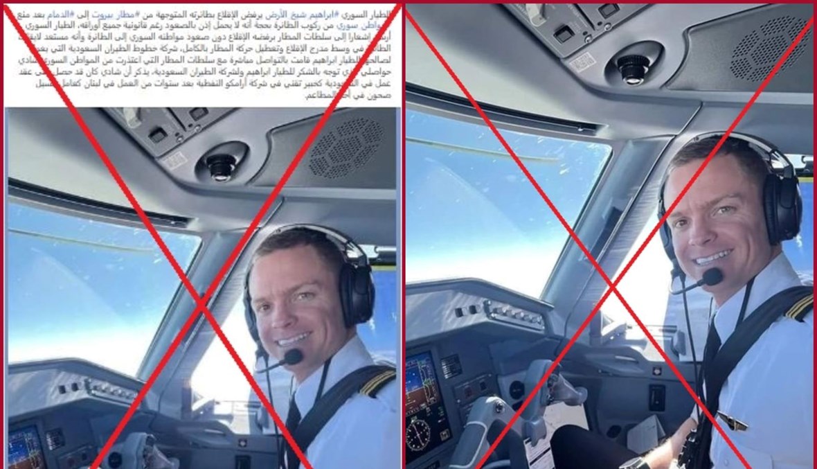 المتداول: صورة تظهر، وفقاً للمزاعم، "الطيار السوري ابراهيم شيخ الأرض الذي رفض أخيرا الإقلاع بطائرته التابعة للخطوط الجوية السعودية من مطار بيروت في رحلة إلى الدمام بالسعودية، وذلك بعد منع السلطات اللبنانية لمواطن سوري من ركوب الطائرة".