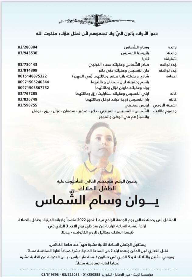 ملاكنا يوهان غادرنا إلى السماء فجر اليوم.إختاره الربّ إلى جواره.ليتمجّد إسم الله٠كسرت قلوبنا يا صغيرنا الحبيب، يا "روح قلبو لجدّو" وحفرت في القلب جرحًا عميقًا. عزاؤنا أنّ الصلاة التي حملتها على كتفيك غسلت الكثير من خطايانا وخطايا العالم وصار لنا قديس في السماء pic.twitter.com/p5kSiFgJM8