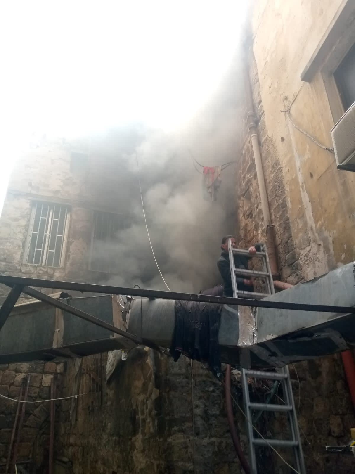 اندلع حريق داخل مستودع في محلة ساحة النجمة في طربلس، حيث تصاعد الدخان إلى أعلى المبنى.