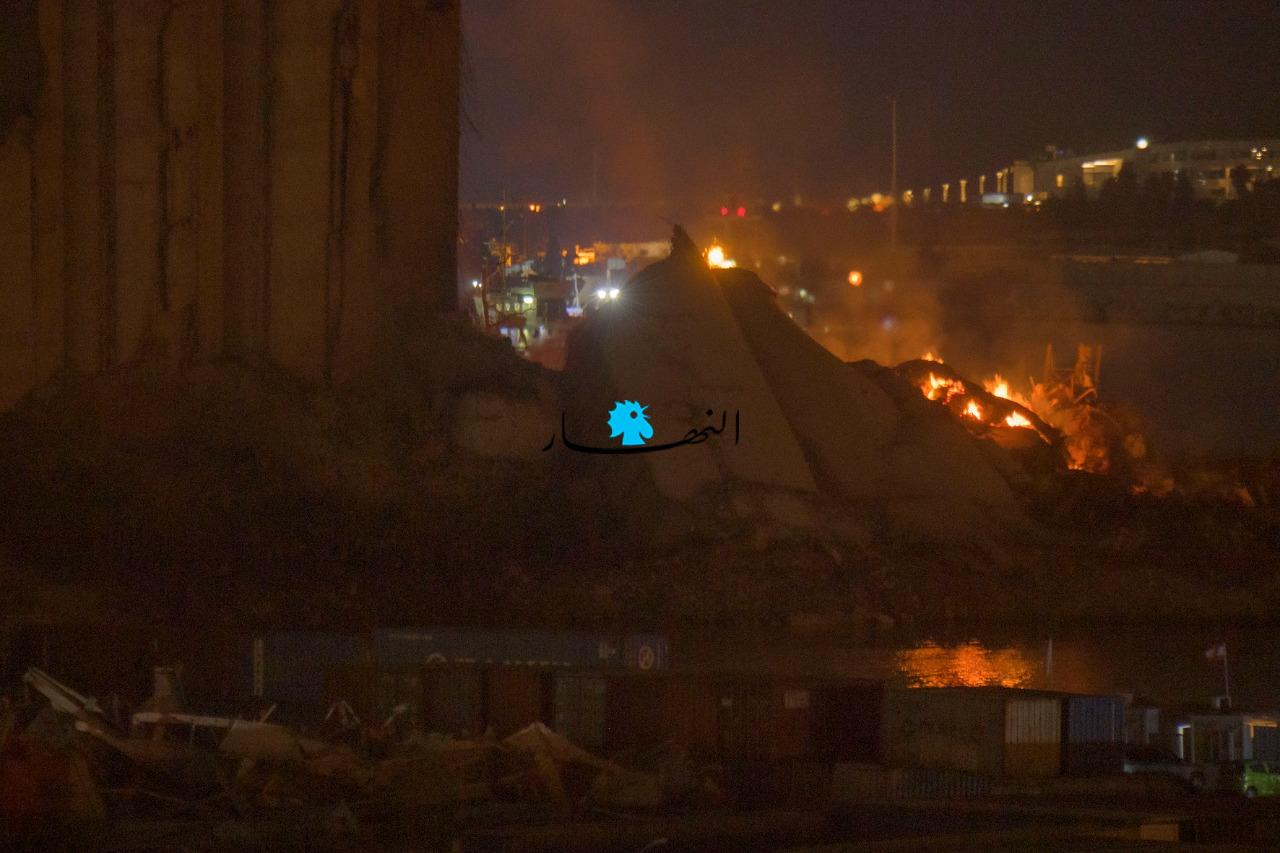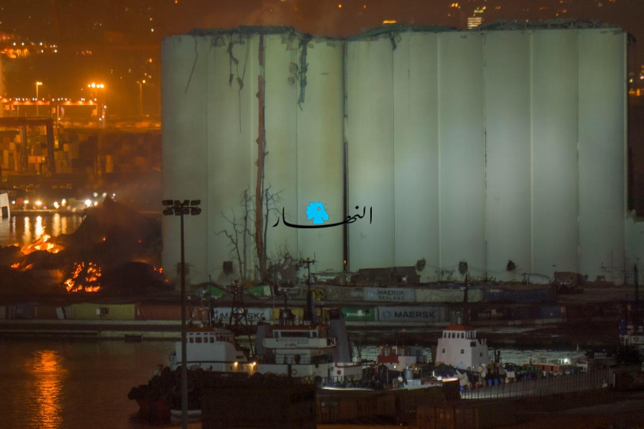 كما أظهرت اللقطات استمرار اشتعال النيران في ركام صوامع القمح التي انهارت عصراً من الجهة الشمالية.