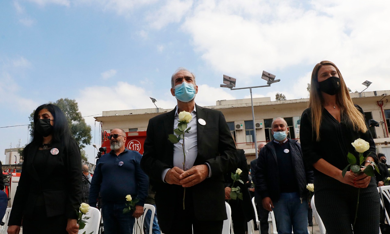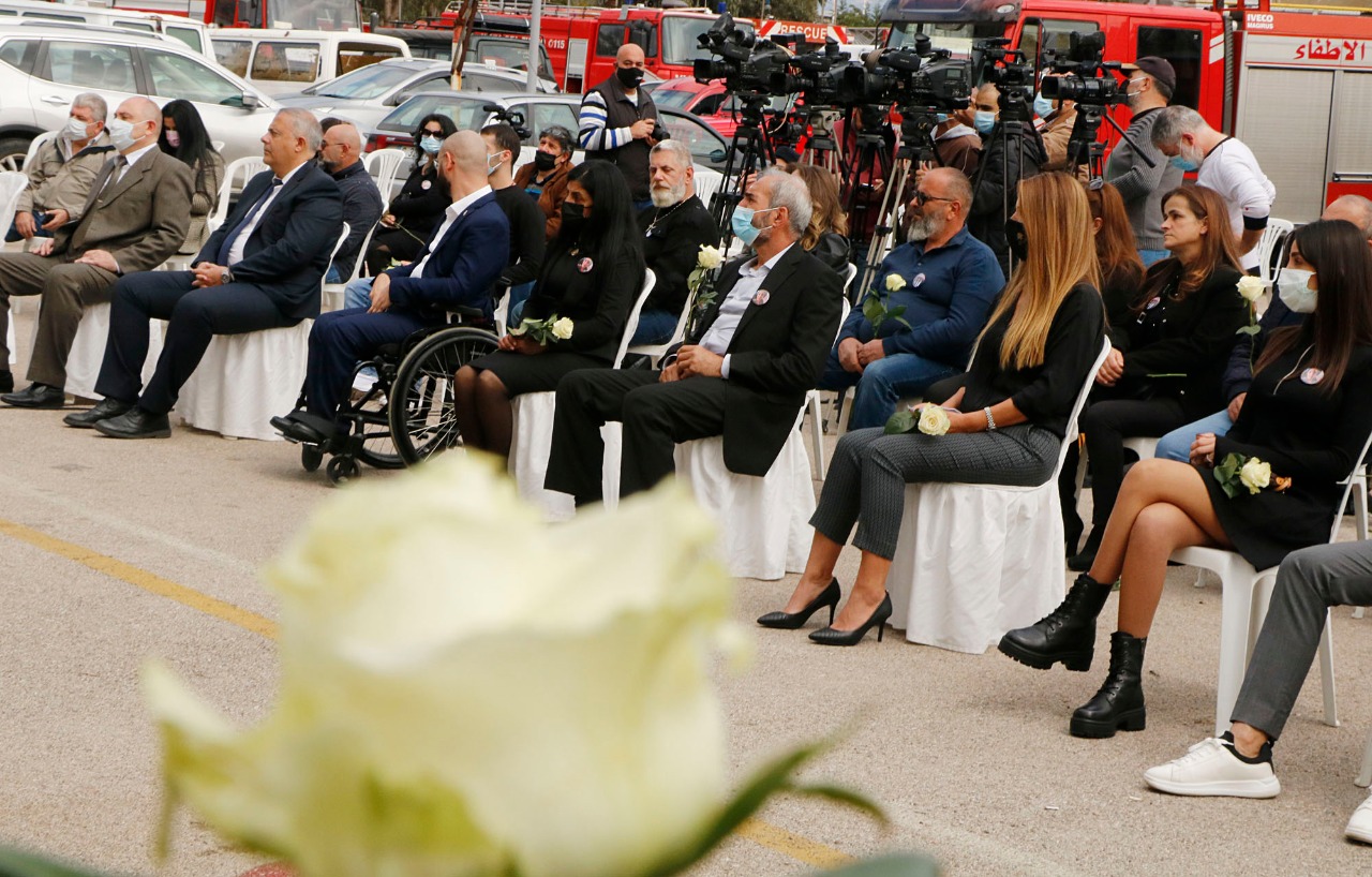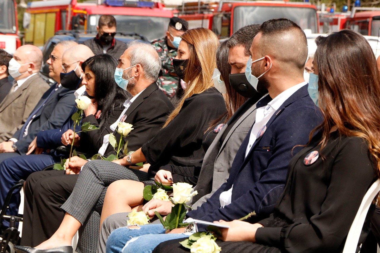 بداية، النشيد الوطني فنشيد فوج الإطفاء، ثم ألقى عبود كلمة طلب فيها "الرحمة لشهداء فوج إطفاء بيروت". وقال: "منذ اليوم الأول لاستلامي مهامي، جئت الى هذا المبنى وتعرفت على الشهداء الأبطال وقلت لهم بإني بجانبهم. ان فوج اطفاء بيروت وحرس بيروت هما من أولوياتي وأنظر اليهما نظرة الأب الى أبنائه، وهذه النظرة ليست للشهداء والعسكريين فقط بل الى عائلاتهم وأحبائهم، فكلّ شهيد غالٍ على قلبنا".