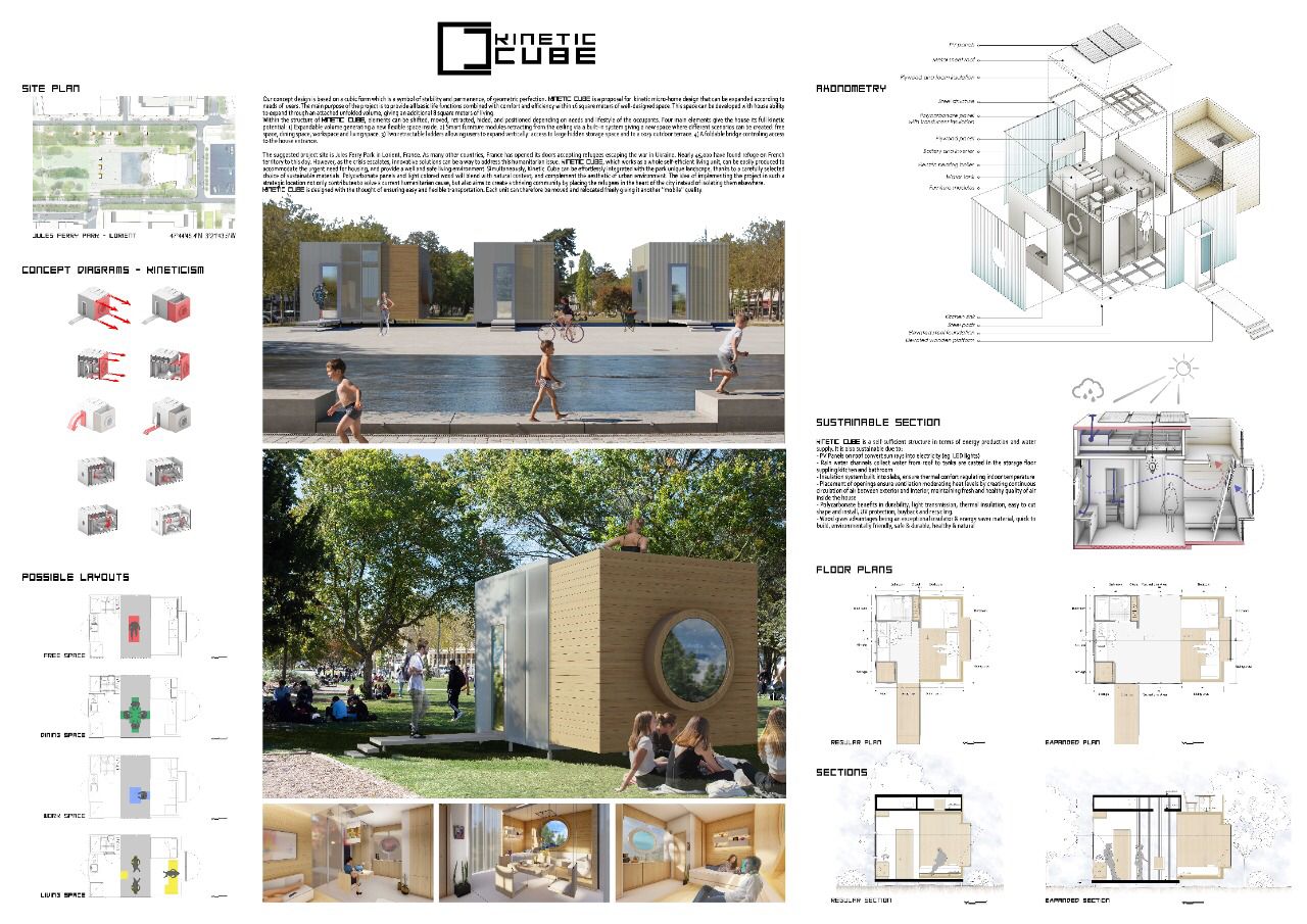 "Kinetic Cube" هو اقتراح تصميم لمسكن صغير حركي يتمتع باكتفاء ذاتي وقابل للتوسعة بحسب حاجات قاطنيه. الهدف الرئيسي للمشروع تأمين جميع الوظائف الحياتية بشكل مريح وفعّال في مساحة 16 متراً مربعاً عالية الدقة في التصميم، قابلة للتوسعة ثمانية أمتار إضافية. يمكن تغيير العناصر داخل المنزل ونقلها وسحبها وإخفائها وفقًا لاحتياجات القاطنين وأسلوب حياتهم. يصنُع "Kinetic Cube" بسهولة لتلبية الحاجة الملحّة للسكن الميسور كما وتوفير بيئة معيشية جيدة وآمنة.