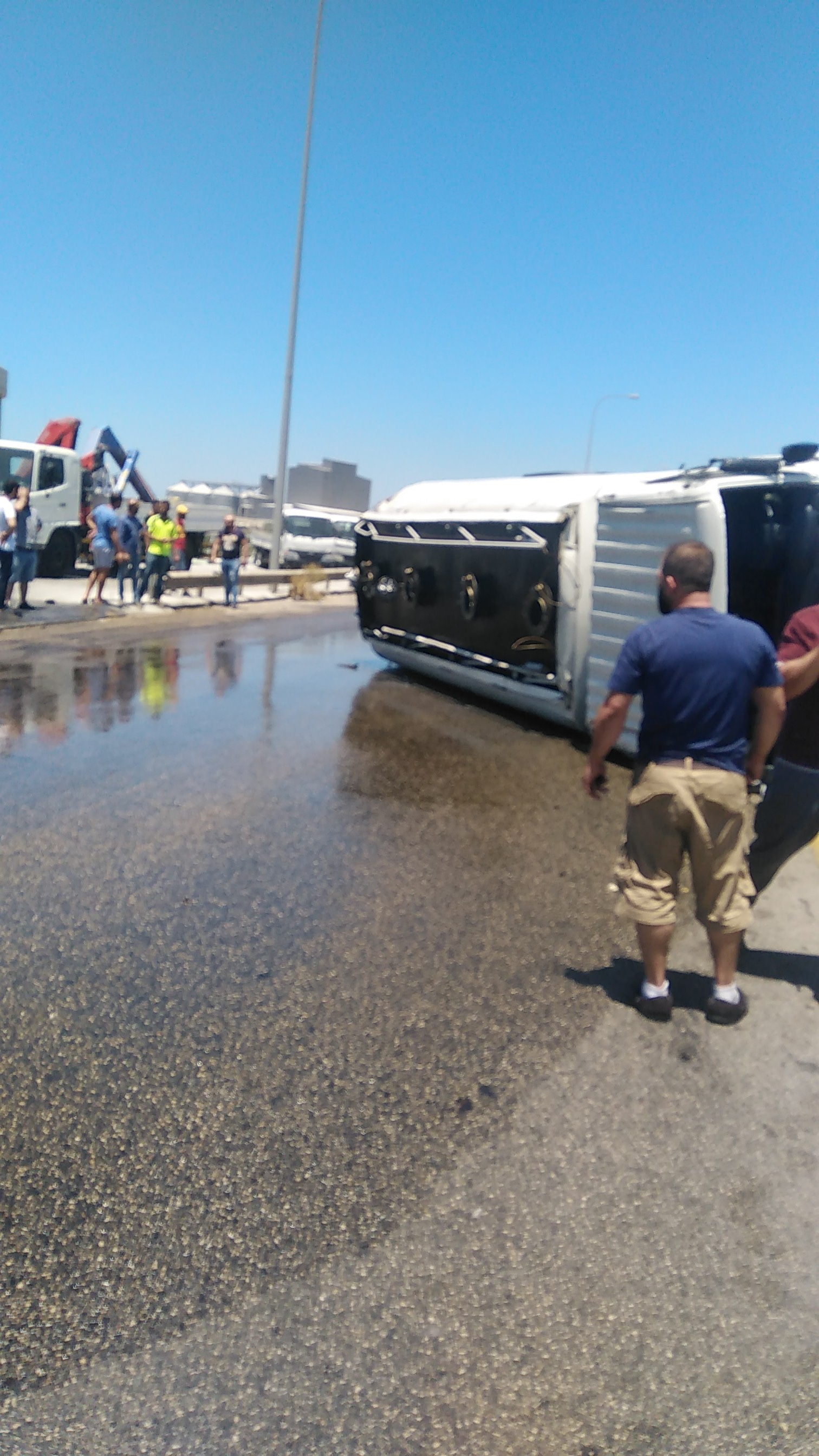 أدّى انقلاب صهريج مازوت وتسرّب المادّة منه، قبل جسر شركة الترابة في شكا، إلى قطع الطريق.