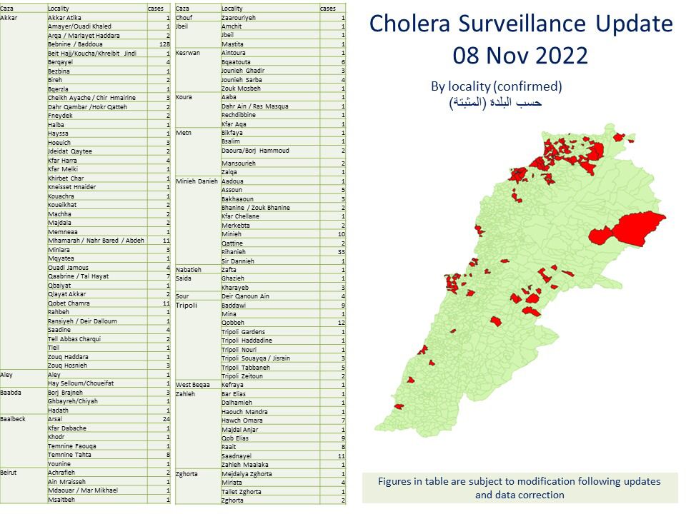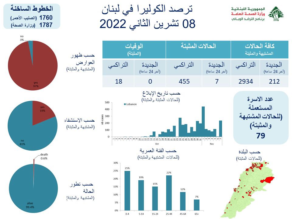 أعلنت وزارة الصحة عن تسجيل 7 حالات جديدة من الكوليرا خلال الساعات الـ24 الماضية، ما يرفع العدد التراكمي إلى 455 حالة مثبتة، مع الاشتباه بـ212 حالة.