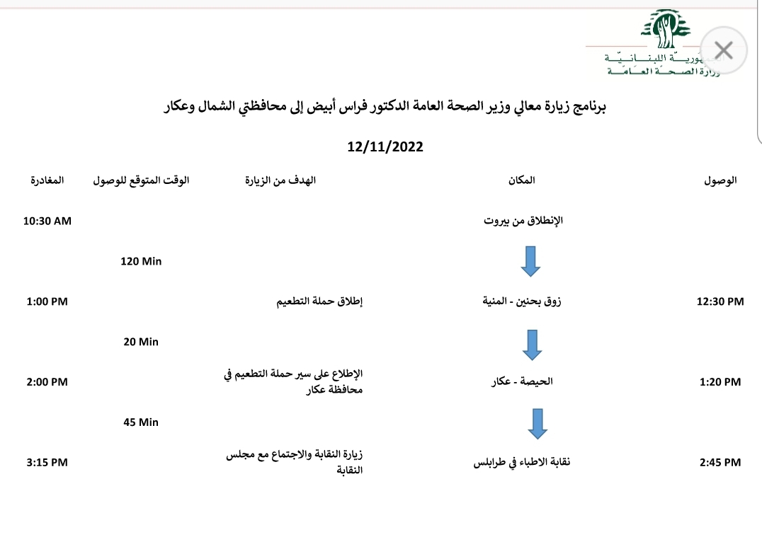 كذلك، يُطلق وزير الصحة في حكومة تصريف الأعمال فراس الأبيض المرحلة الأولى من الحملة الوطنية للتلقيح ضدّ الكوليرا يوم غد، خلال جولة ميدانية سيقوم بها إلى محافظتَي الشمال وعكار.