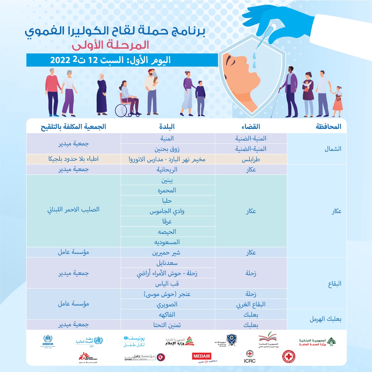يتولى الصليب الأحمر اللبناني على مدى 18 يوماً، تنفيذ حملة التلقيح ضدّ وباء الكوليرا التي أطلقتها وزارة الصحة العامة، اعتباراً من يوم غد في محافظة عكار، بالتنسيق مع المنظمات الشريكة: اليونيسف، منظمة الصحة العالمية، ومفوضية الأمم المتحدة العليا لشؤون اللاجئين (UNHCR).
