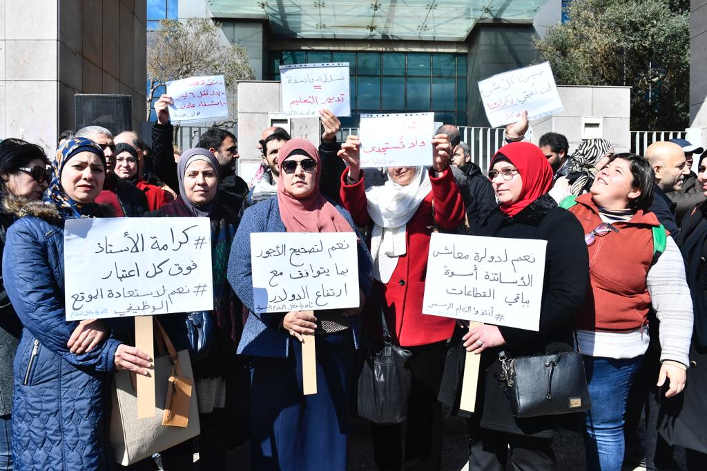 نفذ عدد من الأساتذة اعتصاماً أمام وزارة التربية، للمطالبة بدولرة رواتبهم أسوةً بباقي القطاعات.