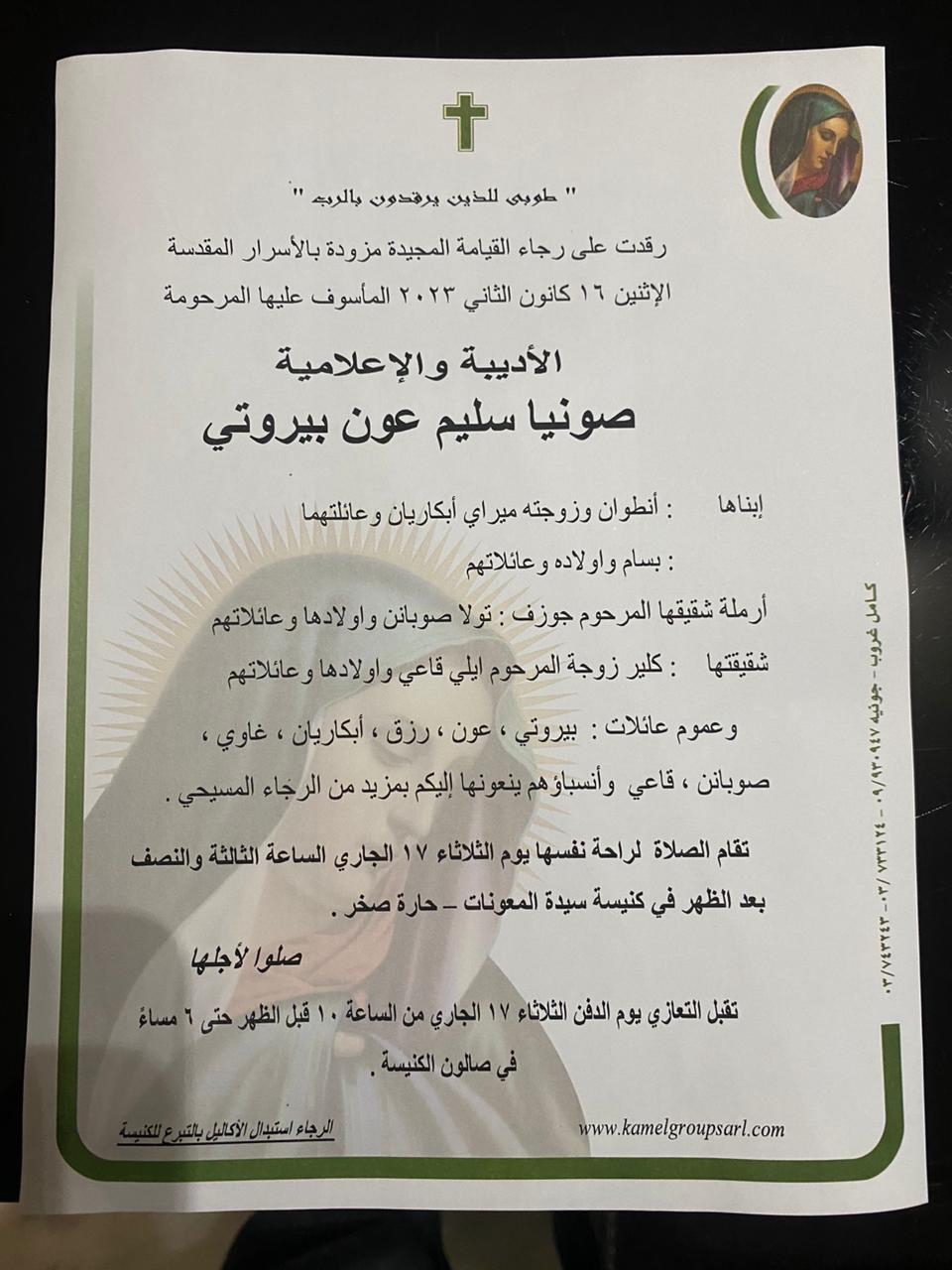 وسيحتفل بالصلاة لراحة نفس الراحلة بعد ظهر غد، في كنيسة سيدة المعونات في حارة صخر.