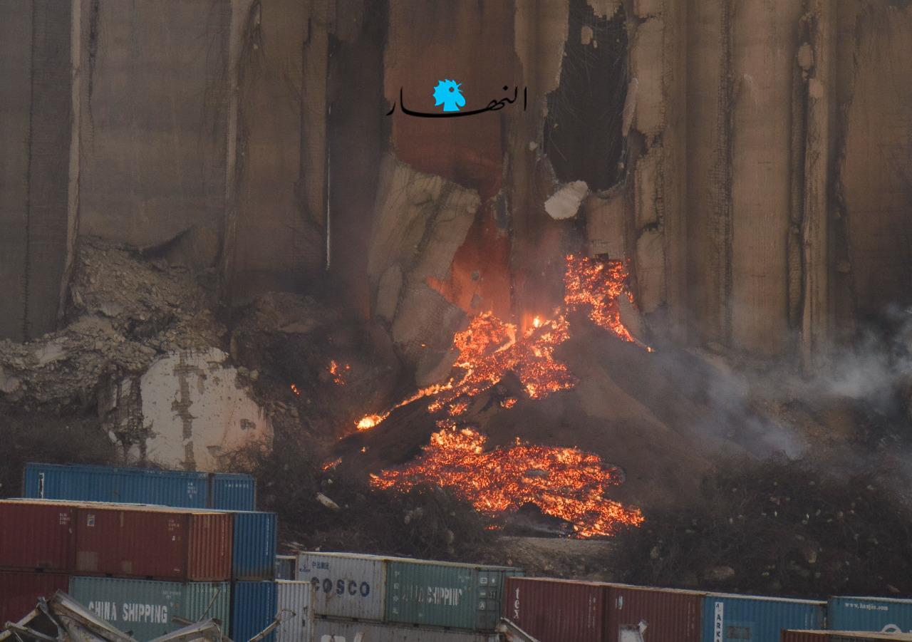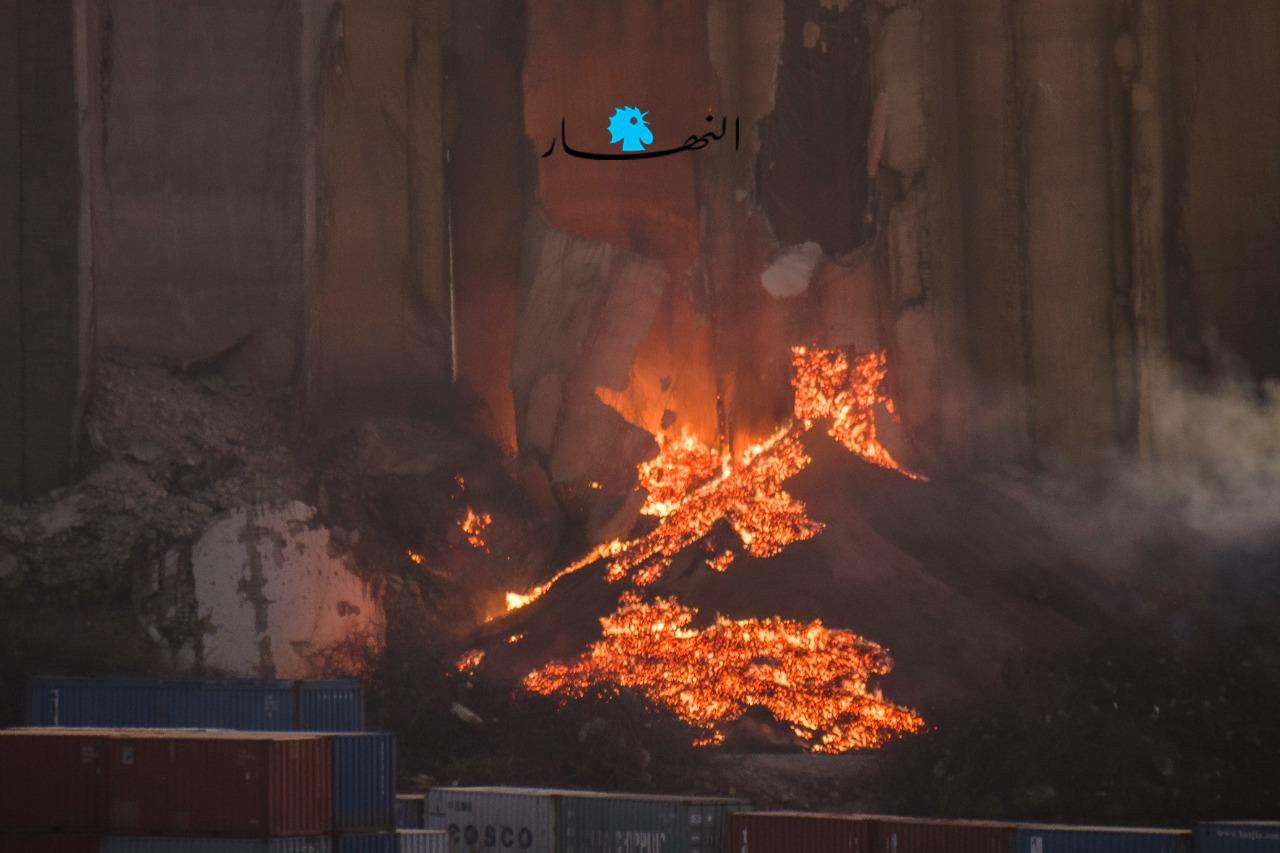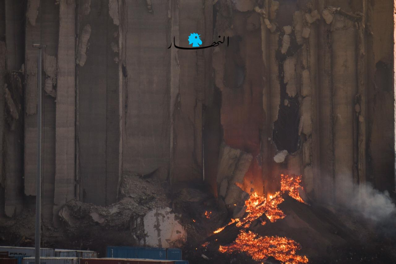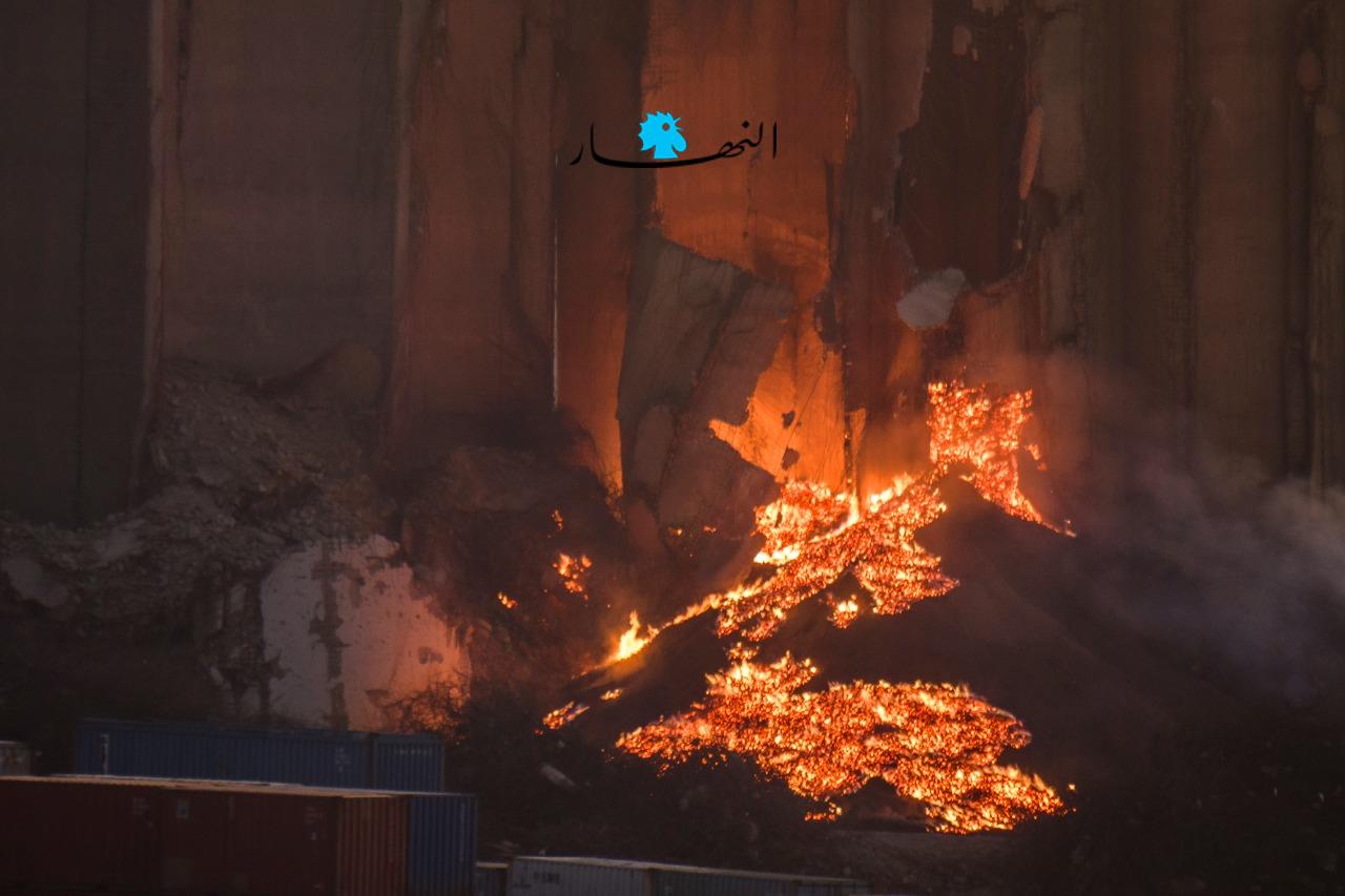 تجدّدت النيران منذ عصر اليوم في أهراء القمح بمرفأ بيروت بشكل كبير، حيث بدت وكأنّها أشبه ببركان مشتعل، فيما ظهرت الأهراء وهي تميل ممّا يُنذر بسقوطها قريباً في حال لم تتمّ السيطرة على النيران المشتعلة.