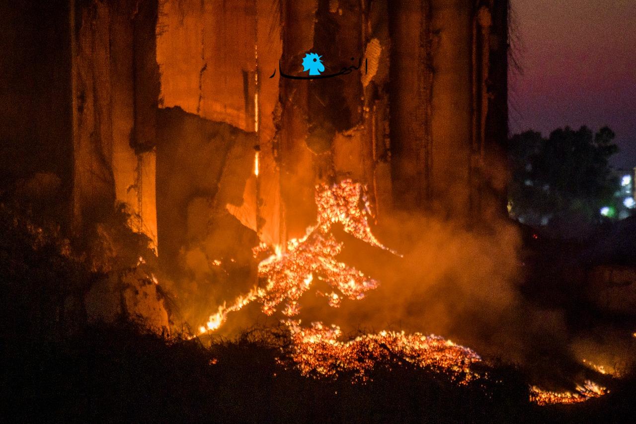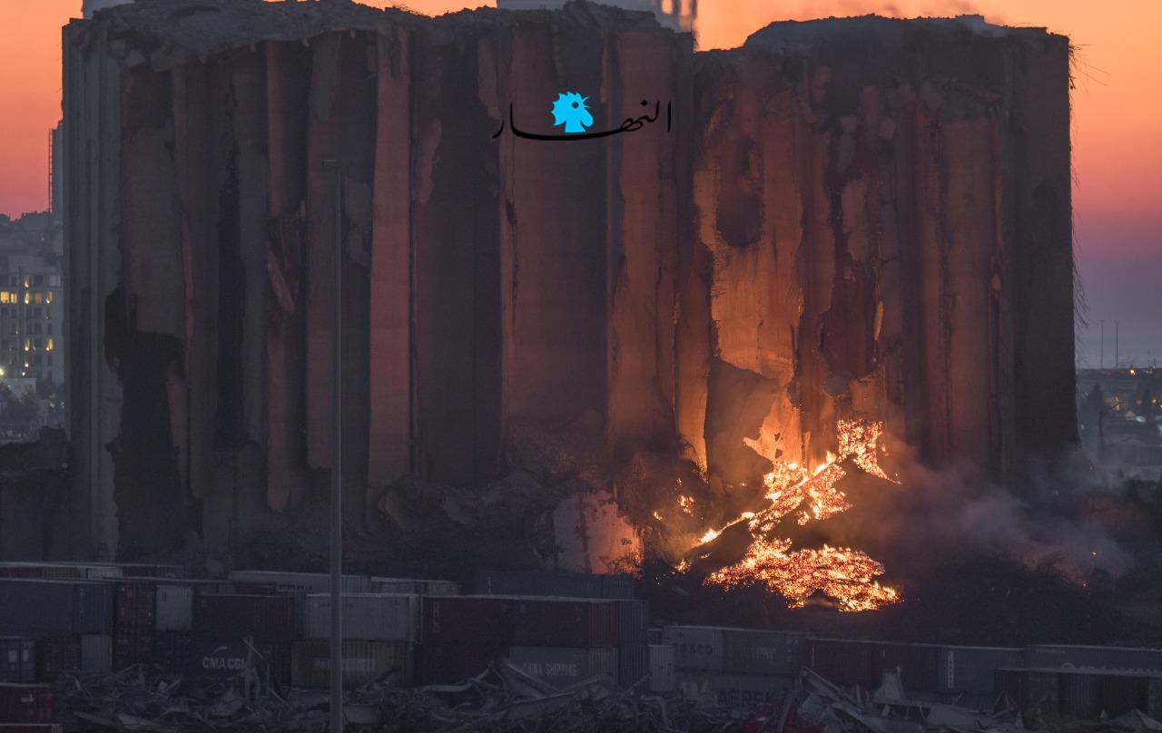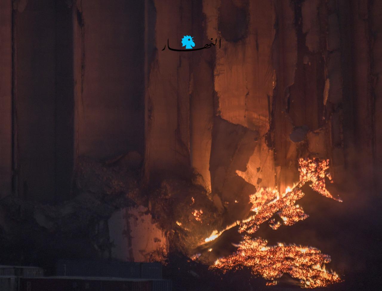تجدّدت النيران منذ عصر اليوم في أهراء القمح بمرفأ بيروت بشكل كبير، حيث بدت وكأنّها أشبه ببركان مشتعل، فيما ظهرت الأهراء وهي تميل ممّا يُنذر بسقوطها قريباً في حال لم تتمّ السيطرة على النيران المشتعلة.