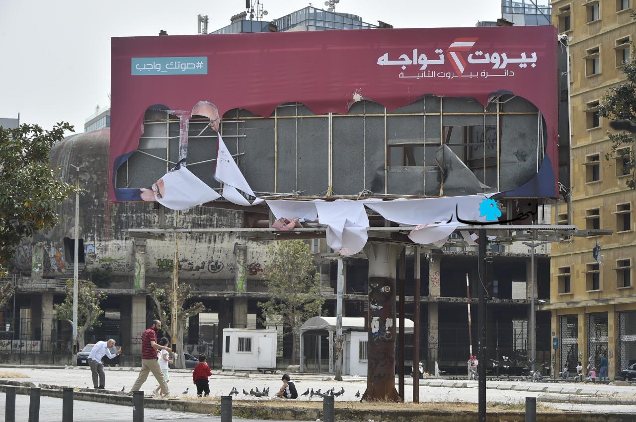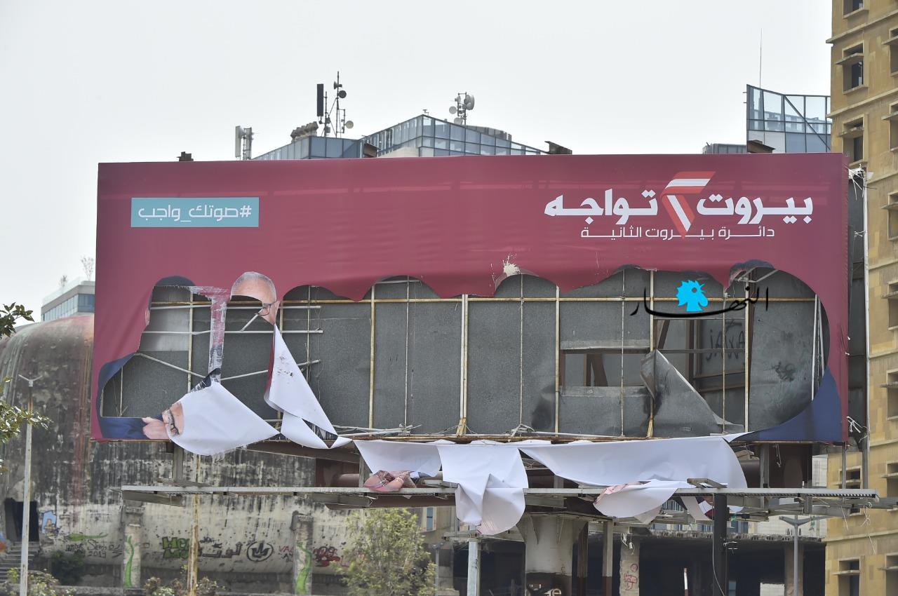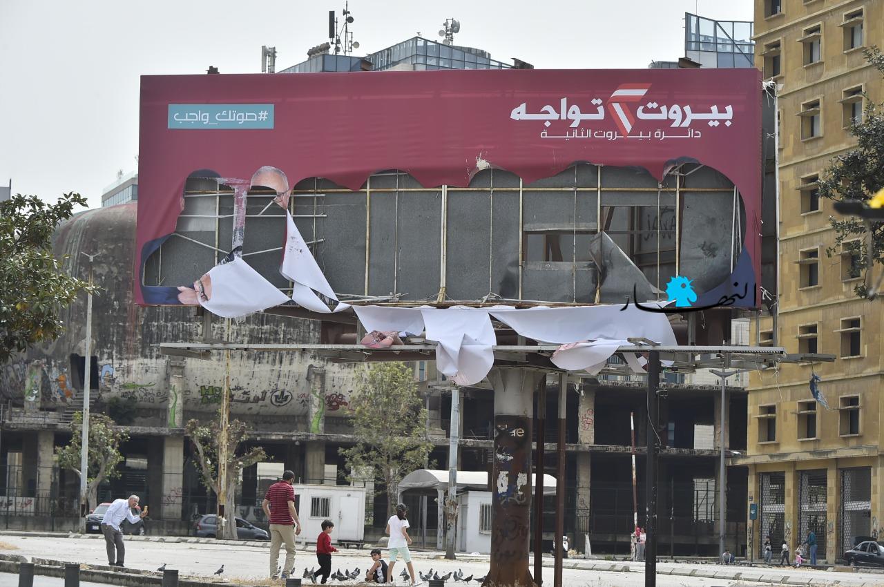 تم تمزيق صورة ضخمة وسط العاصمة تابعة للائحة "بيروت تواجه"، المدعومة من الرئيس فؤاد السنيورة.
