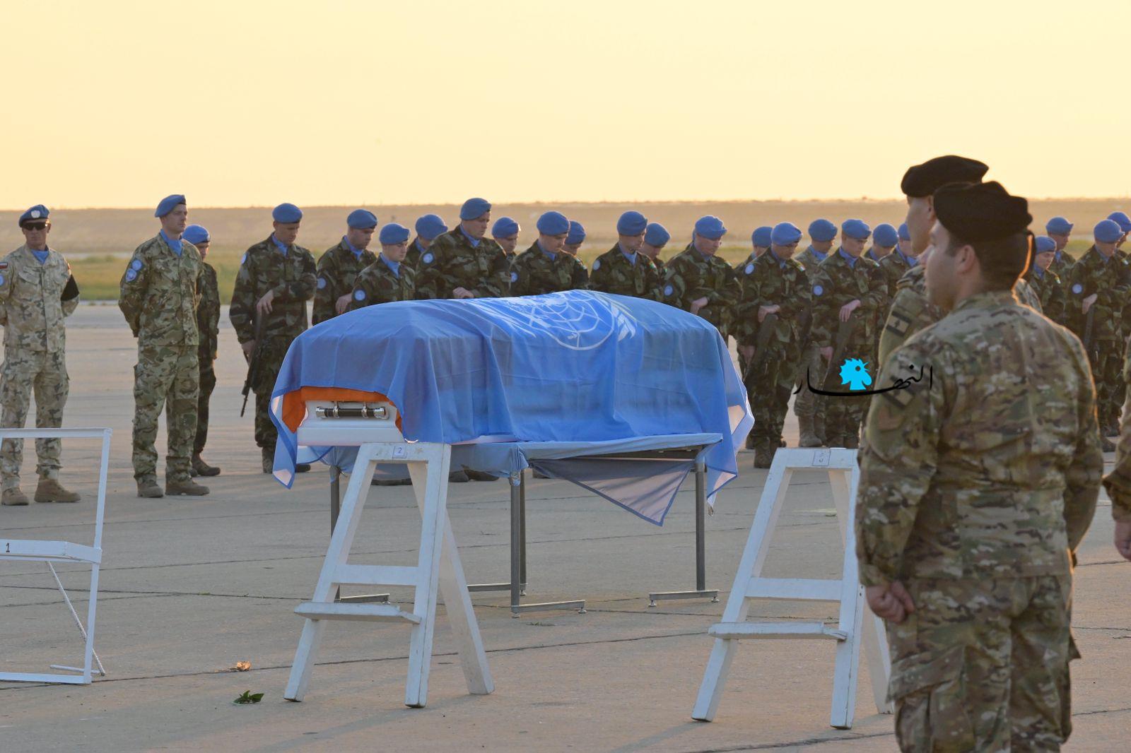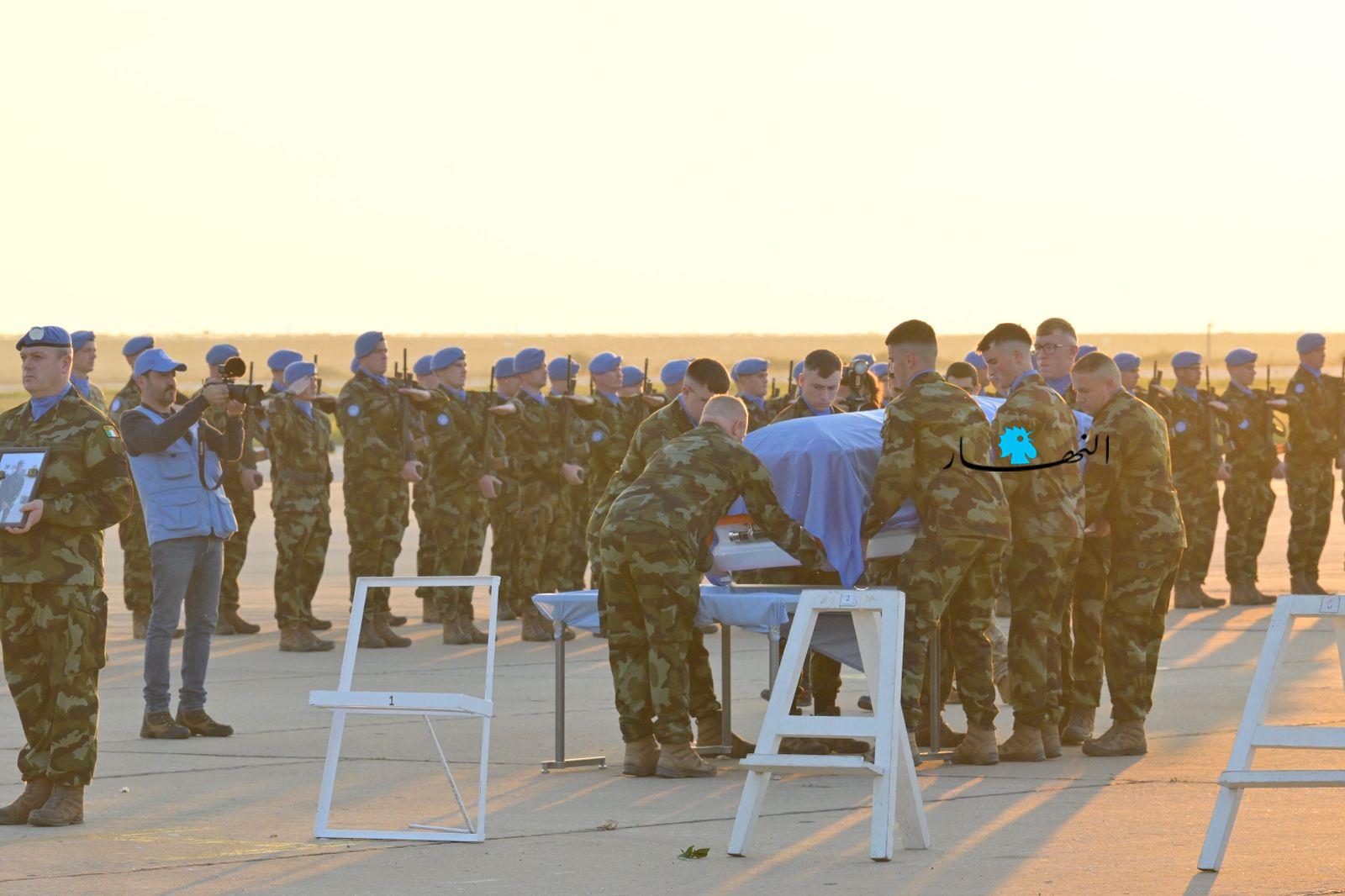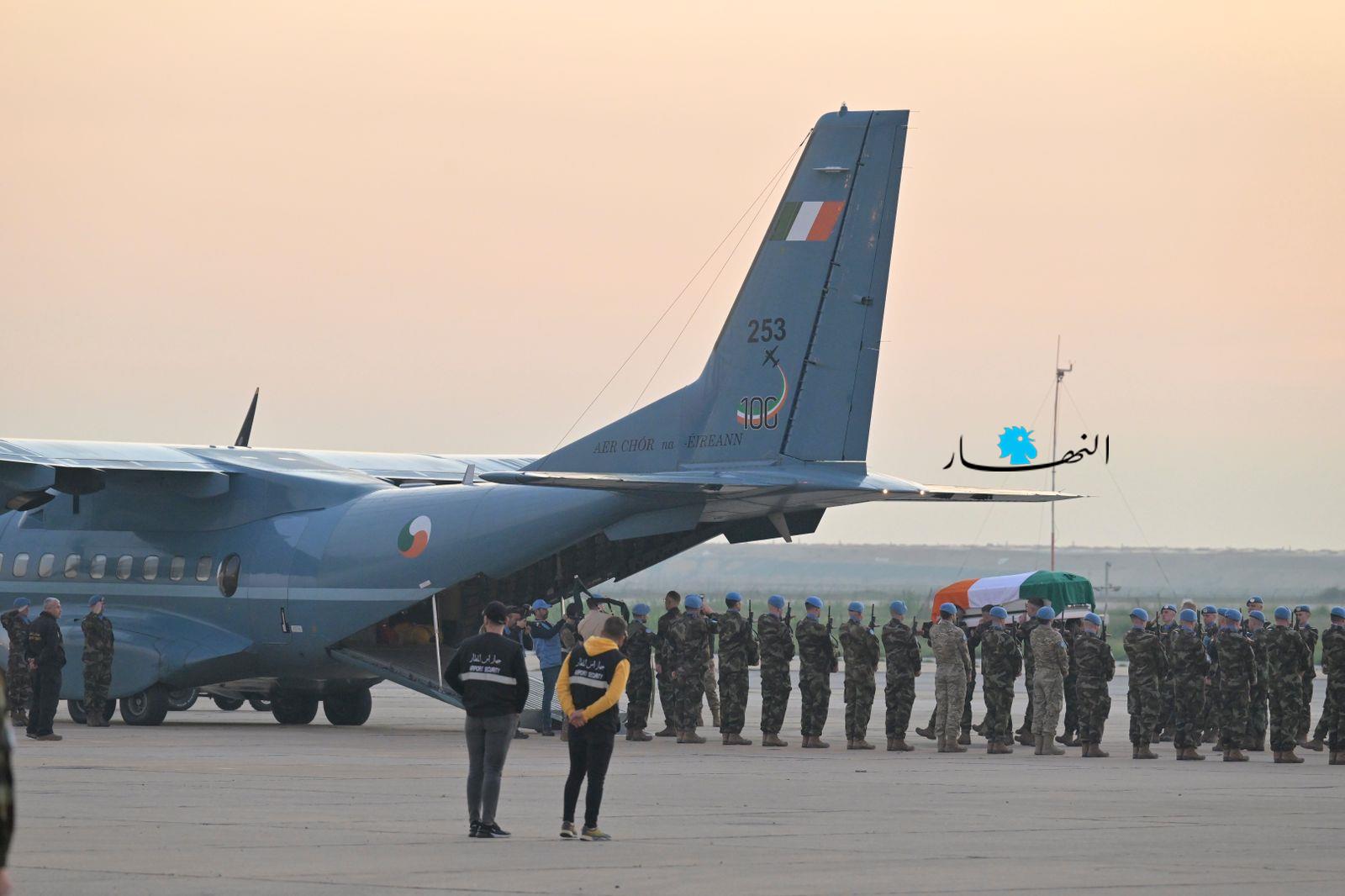 ودّعت القوات الدولية التابعة للأمم المتحدة، "اليونيفيل"، العنصر الإيرلندي الذي قُتل قبل أيام في إشكال العاقبية، في مطار بيروت، قبل نقل جثمانه إلى بلده الأم، إيرلندا، لدفنه.