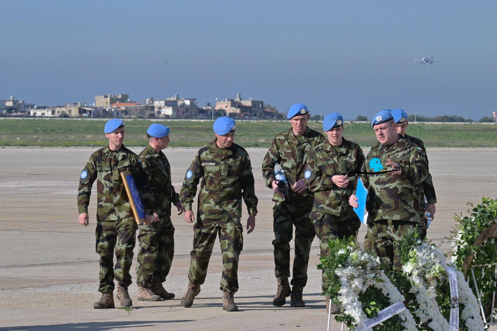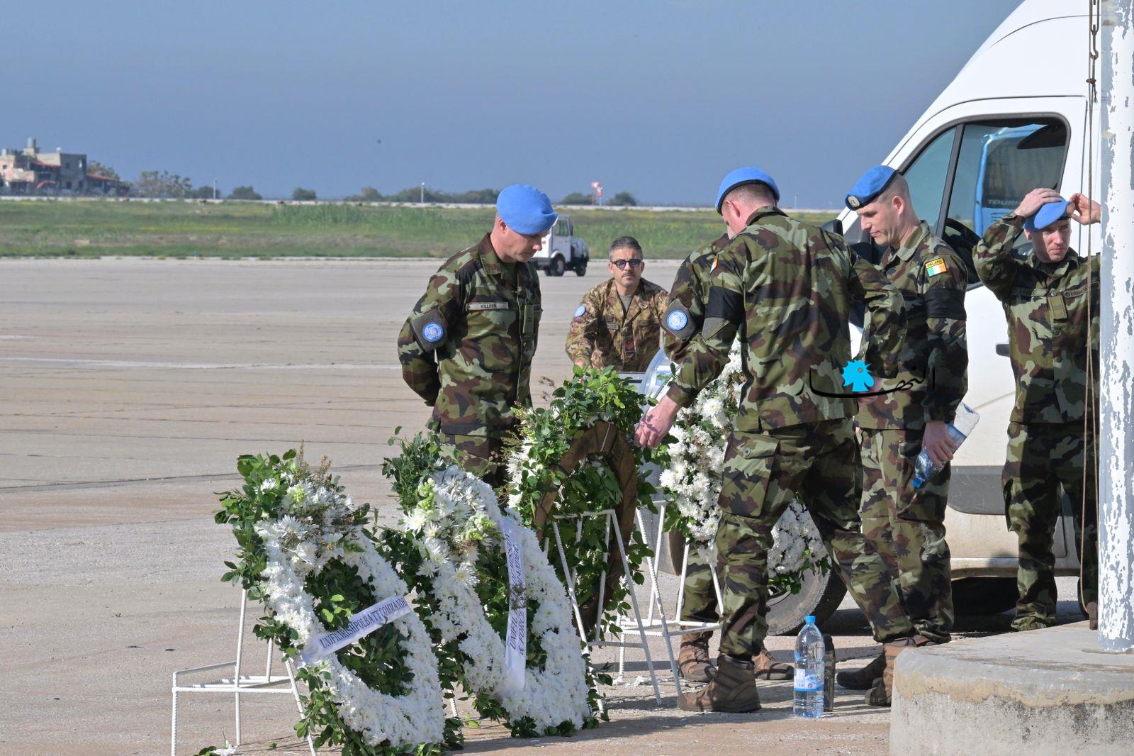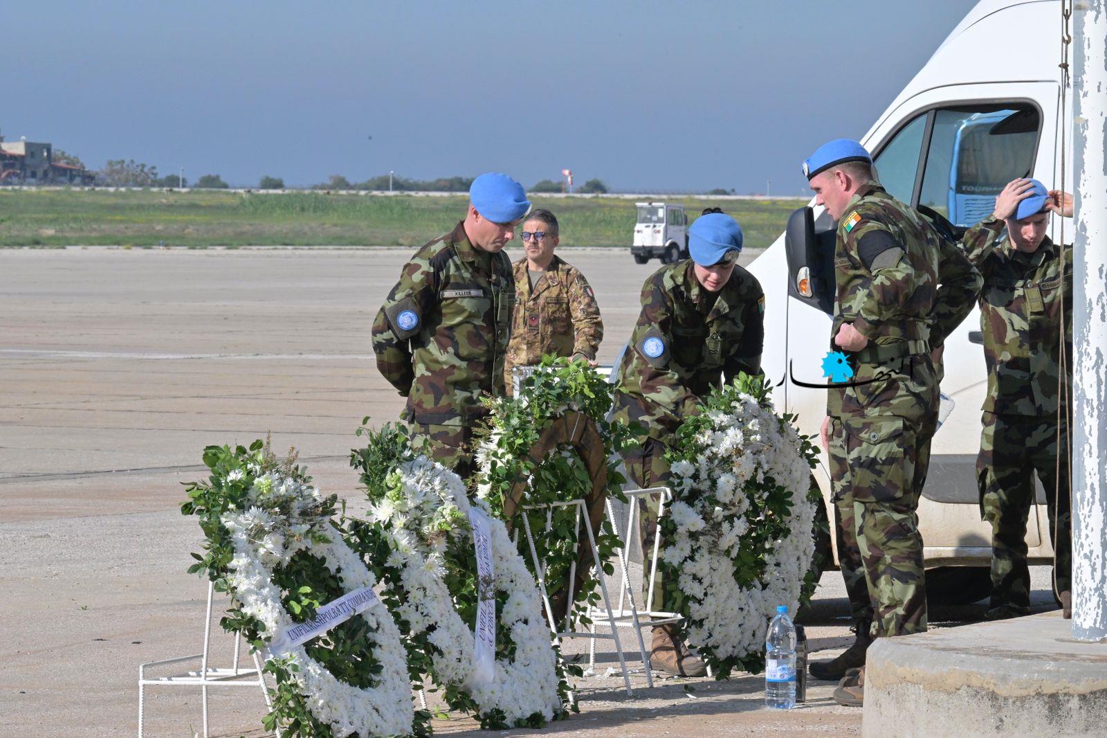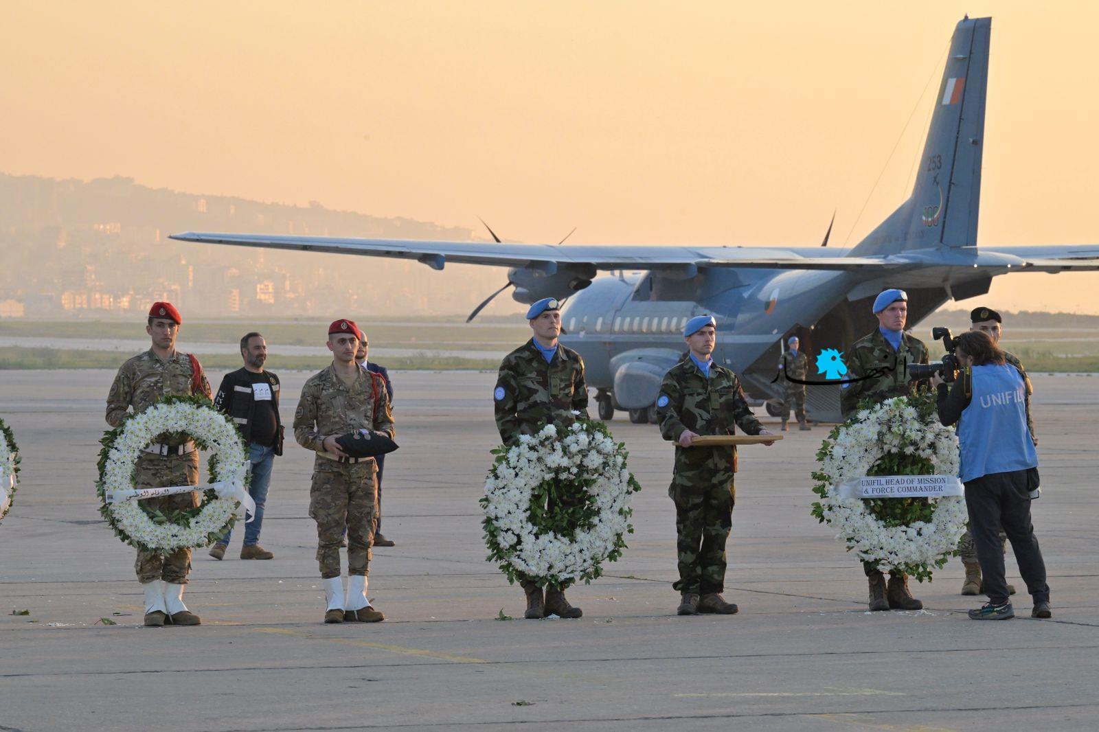 ودّعت القوات الدولية التابعة للأمم المتحدة، "اليونيفيل"، العنصر الإيرلندي الذي قُتل قبل أيام في إشكال العاقبية، في مطار بيروت، قبل نقل جثمانه إلى بلده الأم، إيرلندا، لدفنه.