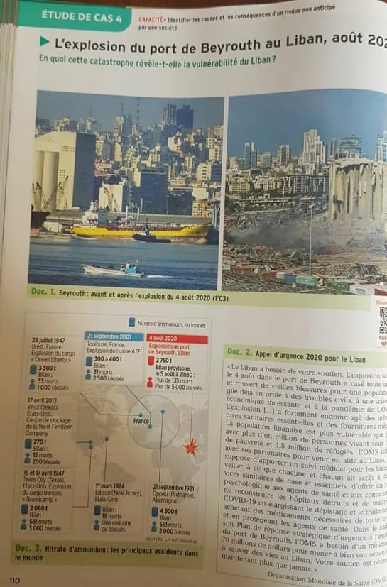 في التعديلات التي أدخلتها فرنسا حديثاً على مناهجها، خصصت درساً في كتاب تاريخ وجغرافيا عن انفجار مرفأ بيروت المروّع في 4 آب 2020 لمناقشته ودراسته كحالة. وتعمل الجهات التربوية الفرنسية سنوياً على مواكبة أي تطور له أبعادا عالمية، فأدخلت سريعاً الانفجار في الكتاب، وهي تترك للتلميذ خيارات التفسير والاستنتاج. أما المدخل، فمتعلق أيضاً بدرس نيترات الامونيوم من ناحية خطورتها وأيضاً استخدامها وكيفية تخزينها بهدف التوعية، فيما تلامذة لبنان يدرسون في مناهج التاريخ والجغرافيا عبر التلقين والحفظ ما حدث في القرون الوسطى، ولا نستطيع حتى اطلاق السنة الدراسية. والاهم أن الدرس المتعلق بانفجار المرفأ يفتح في فقراته على استنتاجات وتحض على الدعم والمساعدة.