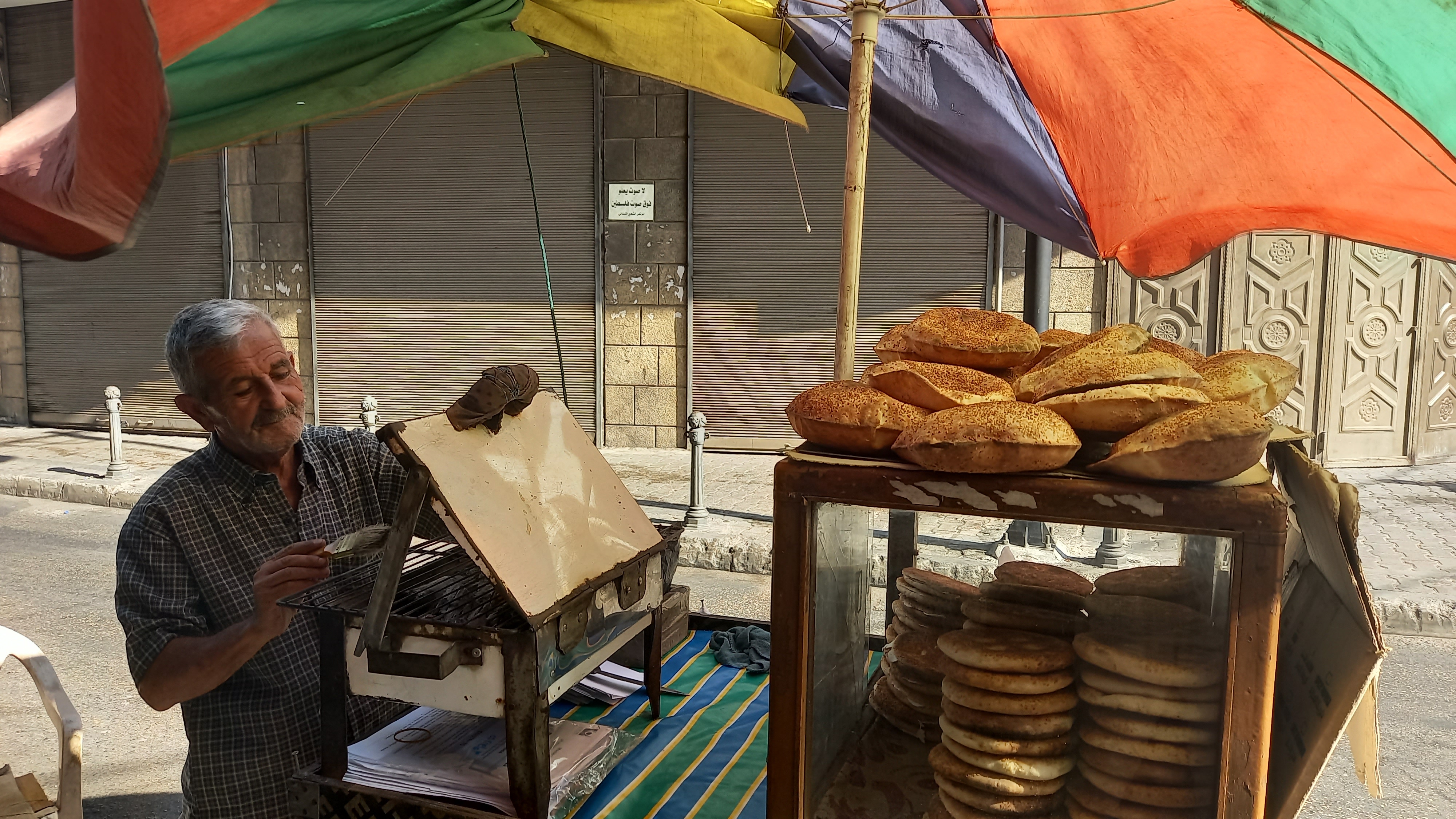 وينزل نعيم اللوز، الأب لصبي وابنتين، من منزله الكائن في حارة من سوق الصاغة، لجرّ عربة الكعك حتى مدخل سوق العطارين. ينوي شراء خضار ليضيفها إلى الكعك الذي يبيعه، يقول "أربح يوميًا بحدود خمسين ألف ليرة، إن استثنينا من ثمن الكعكة تكلفة الفحم والكعك والجبن"، مشيرًا إلى أنّه يبيع الكعكة بأربعة آلاف ليرة، إذ يفضل تخفيض هامش الربح "لأنني موجود في منطقة شعبية ويجب أن أشعر بالناس".