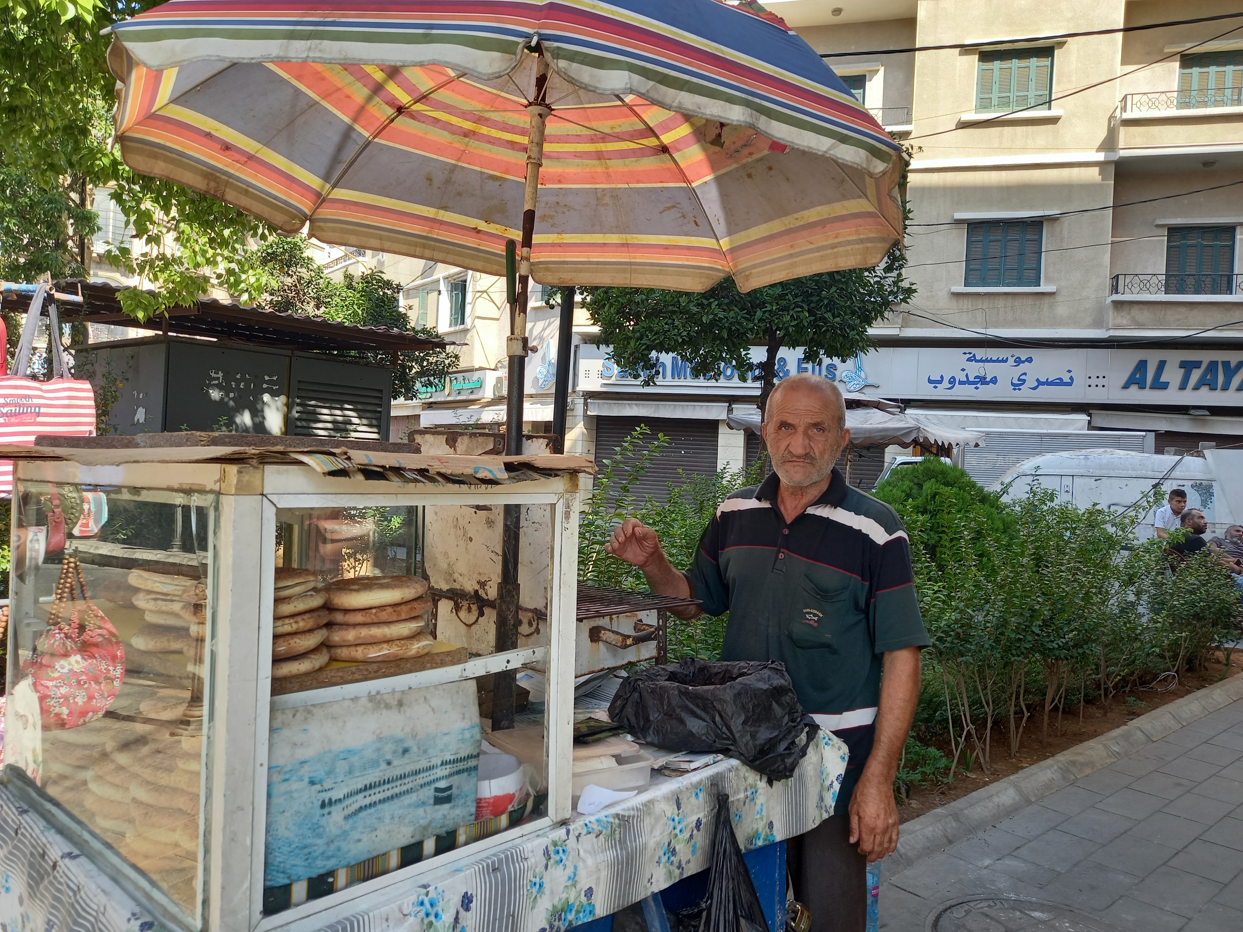 منذ السابعة صباحًا، يقف رياض اللالا وراء عربة كعك مظللة بشمسيّة ملوّنة، كان يجوب بها شوارع طرابلس منذ خمسين سنّة، ليؤمّن بها خبز يومه "لكن المصلحة تدهورت من السماء الى الأرض"، وفق البائع السبعيني، الذي ينتظر زبونَا يمرّ في شارع ضيق يربط التل بالسرايا العتيقة، حيث تجمّدت حركة البيع والشراء منذ بداية الأزمة.