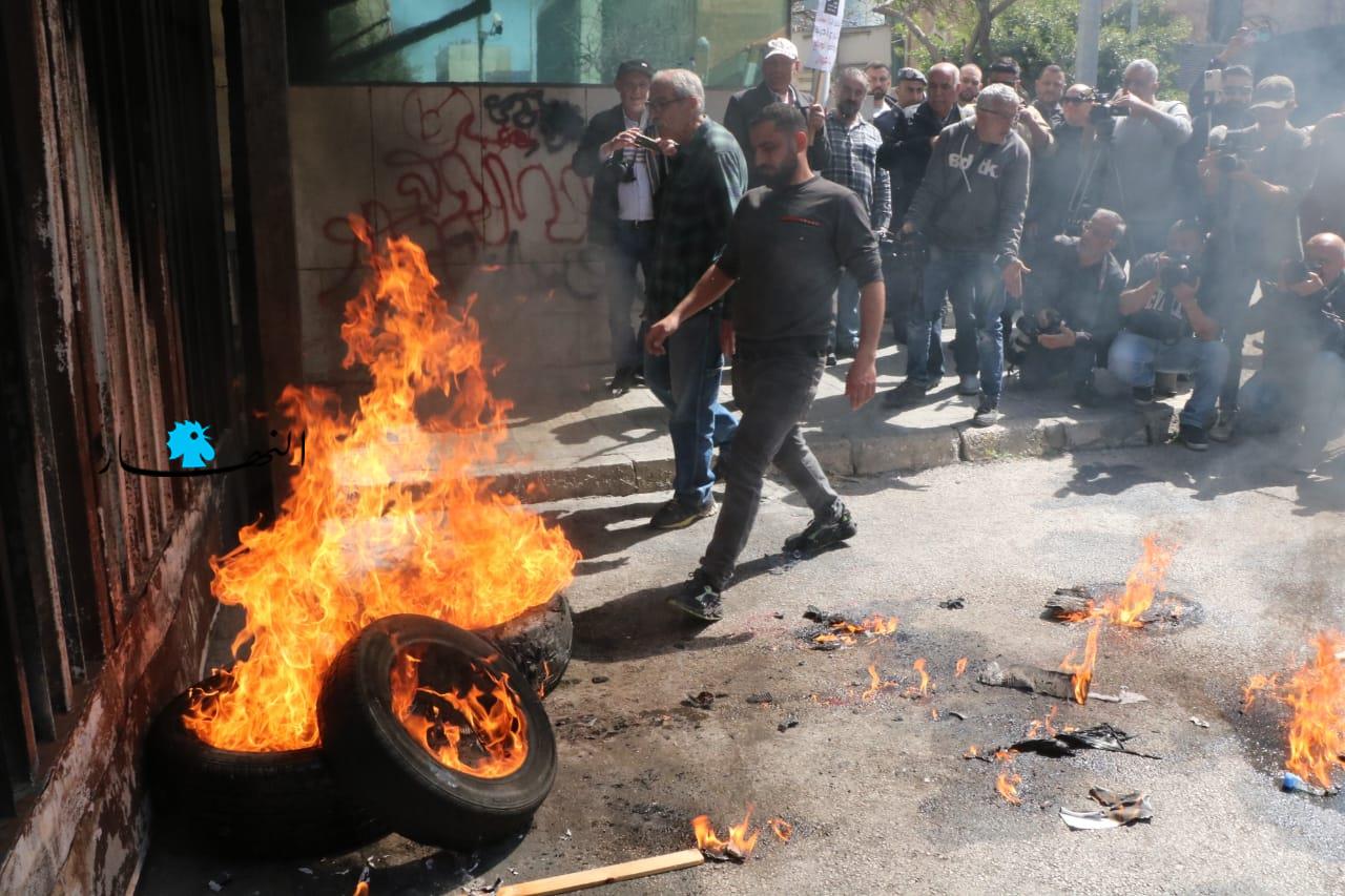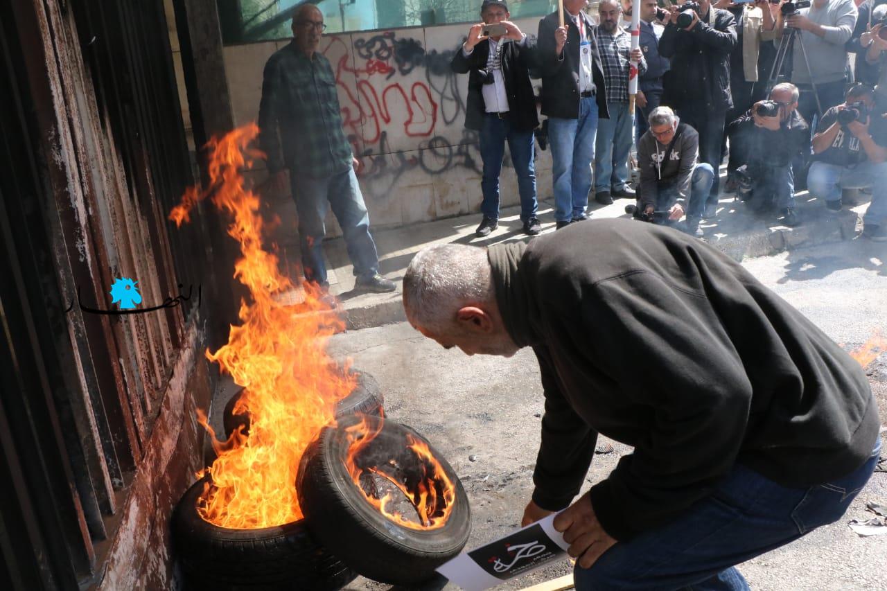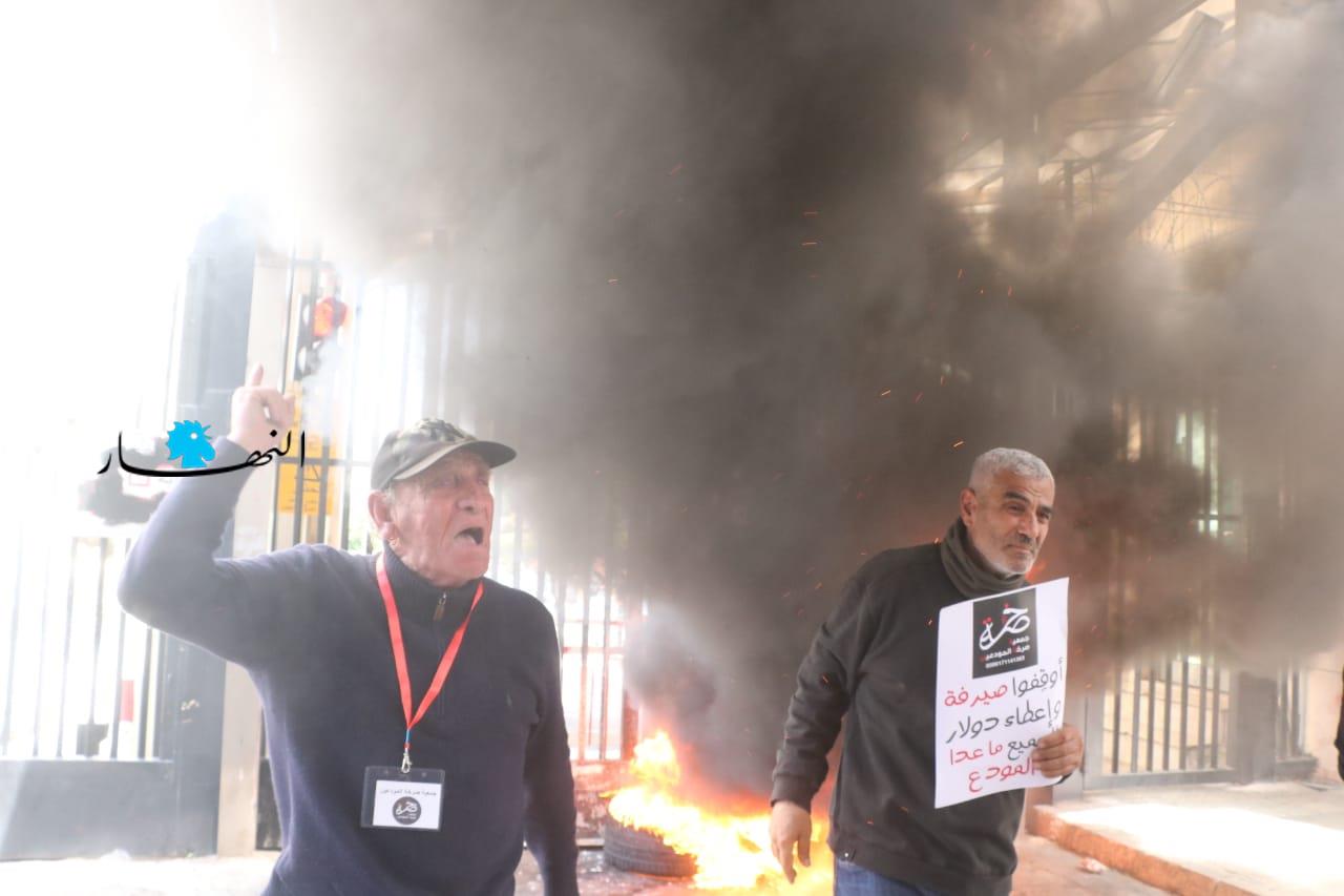 وأطلق عدد من المعتصمين المفرقعات النارية في اتجاه مصرف لبنان، كما عمد البعض إلى إشعال الإطارات أمام مدخل المصرف، وقطع الطريق أيضاً بالإطارات المشتعلة.