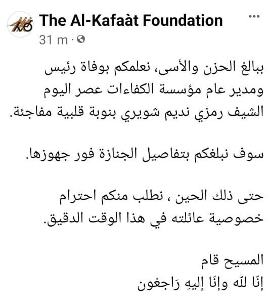 ونعت، مساء اليوم، المؤسسة مديرها عبر صفحتها على "فايسبوك"، مشيرة الى أن تفاصيل الجنازة سيتم الابلاغ عنها فور جهوزها.
