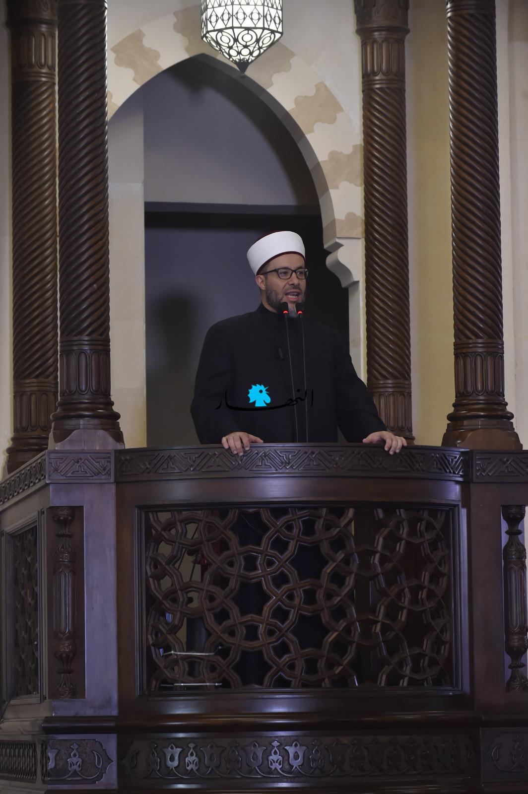 وألقى أمين الفتوى في الجمهورية اللبنانية الشيخ أمين الكردي خطبة العيد بتكليف من مفتي الجمهورية الشيخ عبد اللطيف دريان، وأمّ المصلين في حضور ممثل رئيس مجلس الوزراء المدير العام لوزارة العدل القاضي محمد المصري، وزير البيئة ناصر ياسين، سفراء، وقائد شرطة بيروت العميد أحمد عبلا وأعضاء من المجلس الشرعي الإسلامي الأعلى، شخصيات سياسيّة، اجتماعيّة، نقابيّة وعسكريّة.