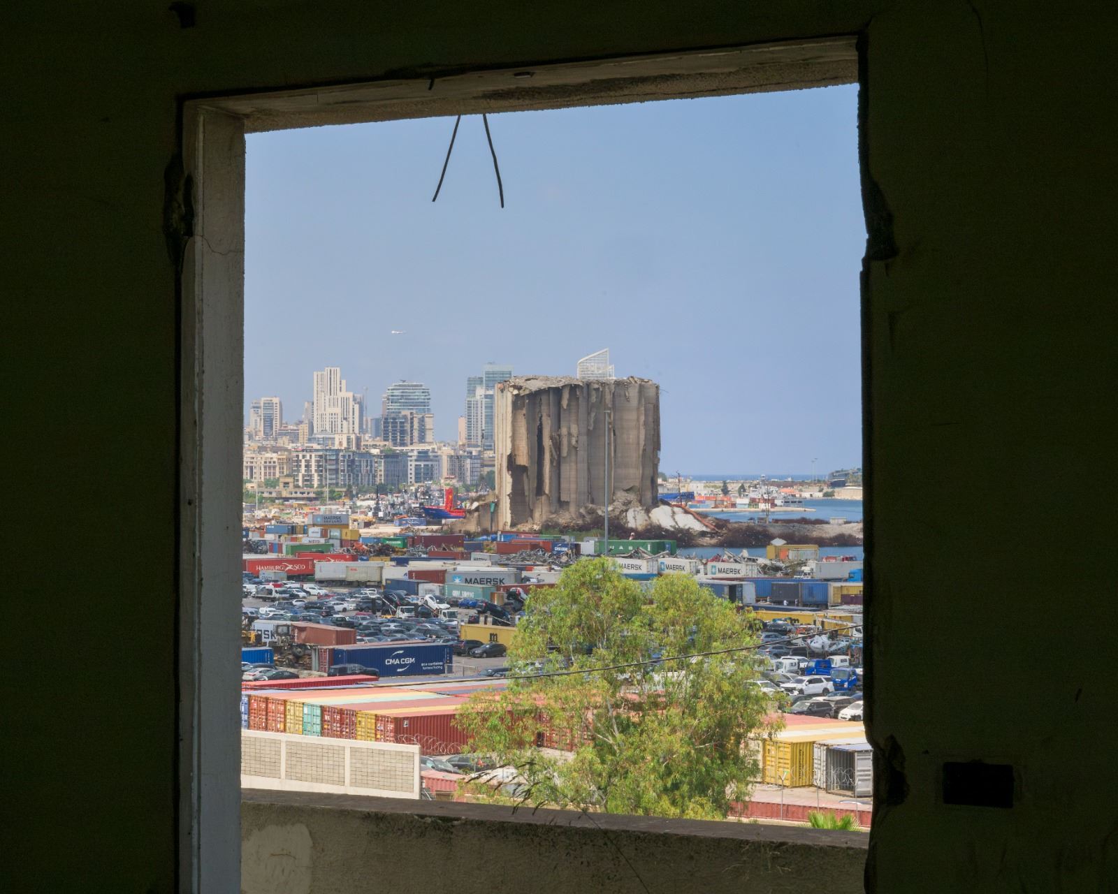 الإهراءات كما بدت من نافذة في الذكرى الثالثة لانفجار المرفأ. (تصوير نبيل اسماعيل).