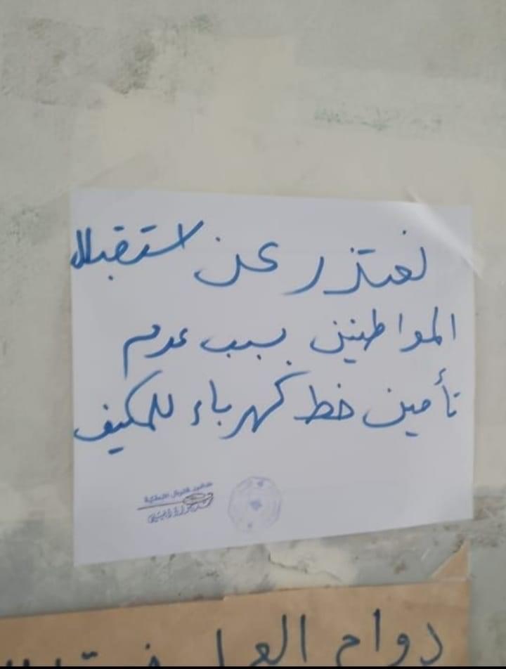 وعلّقت السرايا ورقة عند باب النفوس كُتب عليها: "نعتذر عن استقبال المواطنين بسبب عدم تأمين خط كهرباء للمكيّف".