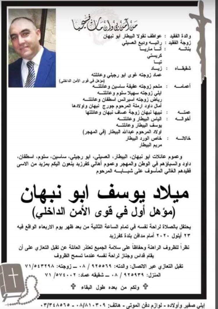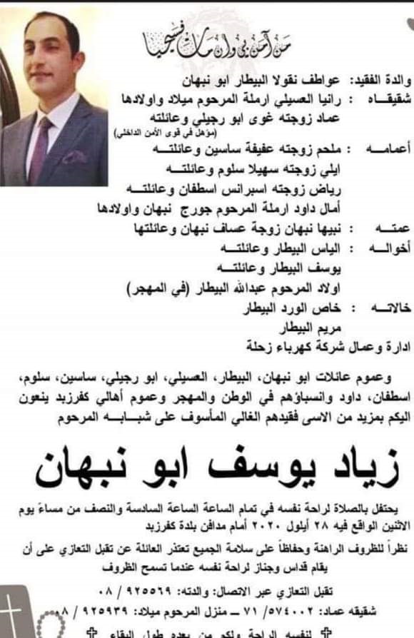 اختطف فيروس كورونا شقيقين من بلدة كفرزبد، شرقي قضاء زحلة، هما ميلاد وزياد ابو نبهان، حيث كانا قد ادخلا كلاهما الى مستشفى الياس الهراوي الحكومي، جراء مضاعفات اصابتهما وباقي افراد عائلتهما التسعة بالفيروس.