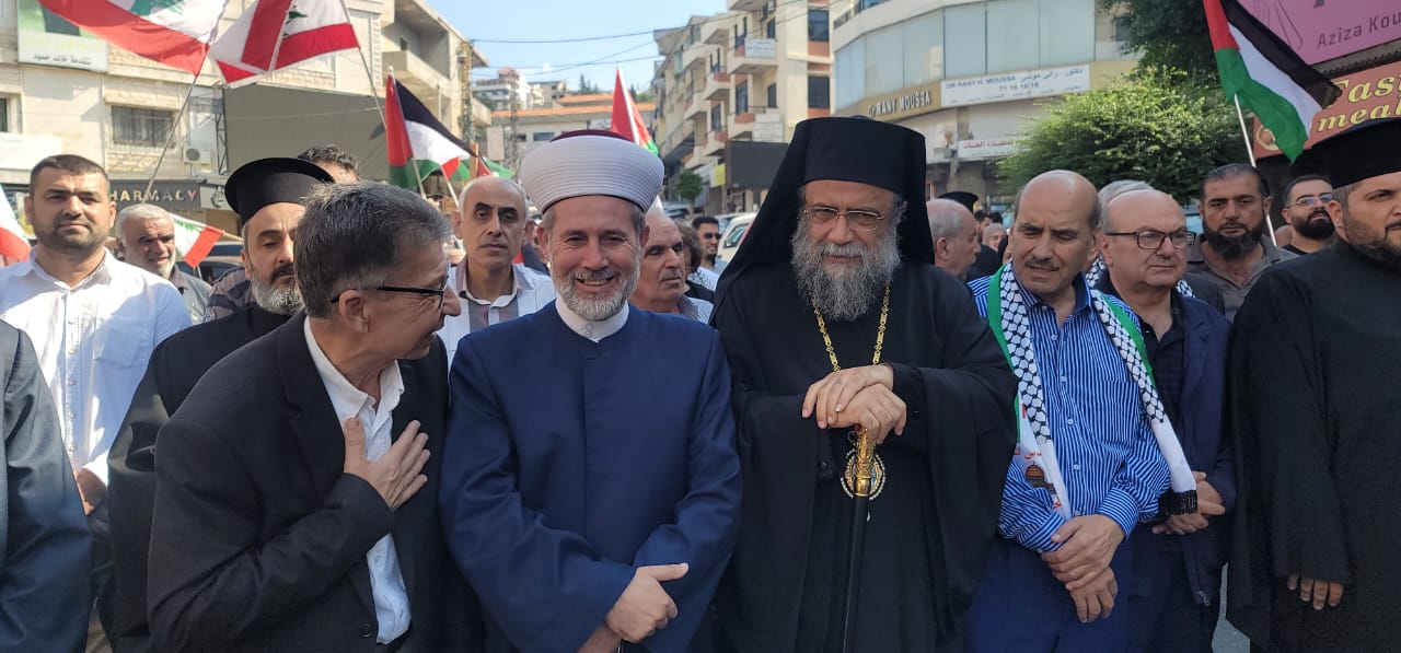 ثم تحدث مطران عكّار وتوابعها للروم الارثوذكس المتروبوليت باسيليوس منصور باسم اللقاء الروحي العكاري مؤكداً على أنّ "جرائم الكيان الصهيوني المحتلّ قد بدأت منذ عَمِل الغرب على إقامة الكيان منذ العام ١٩٤٨، ولكنّ شعبنا الفلسطينيّ الأبيّ وبحضانة كلّ المقاومين المؤمنين مسيحيّين ومسلمين، والمقاومين العرب، صمد ولقّن هذا العدوّ دروساً في التضحية من أجل الأرض والمقدّسات، وانتصرت إرادته على كلّ ترسانة السلاح الغربيّة التي امتلكها العدوّ. وقد قاتل أبناء فلسطين وكلّ المقاومين بشرفٍ وعدالة، وظهر ذلك في معاملة الأسرى الصهاينة".