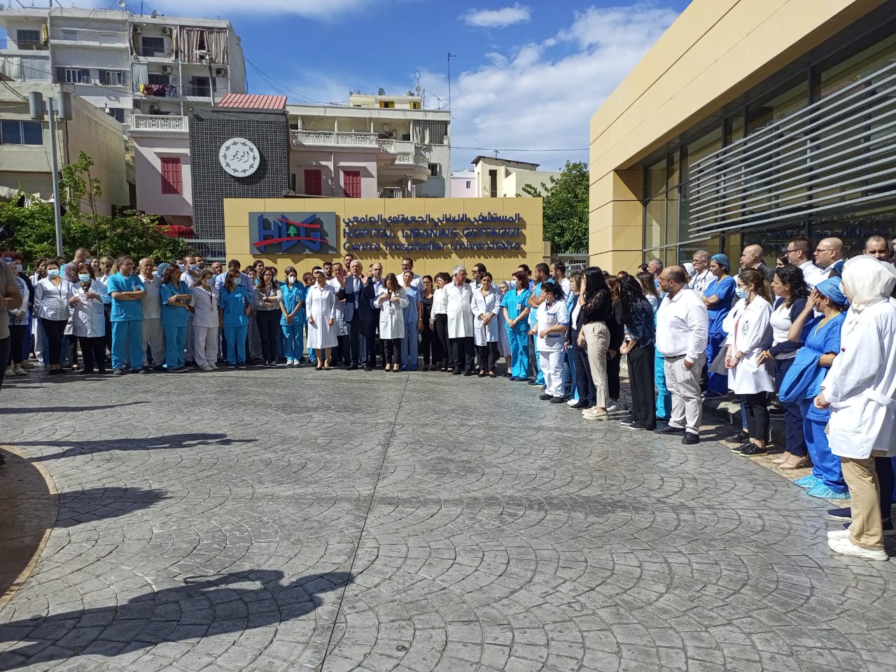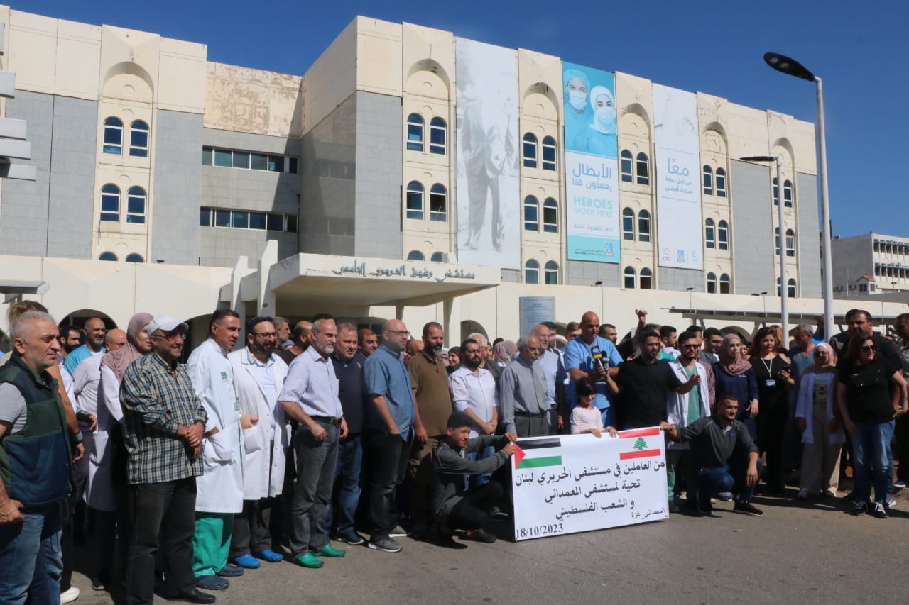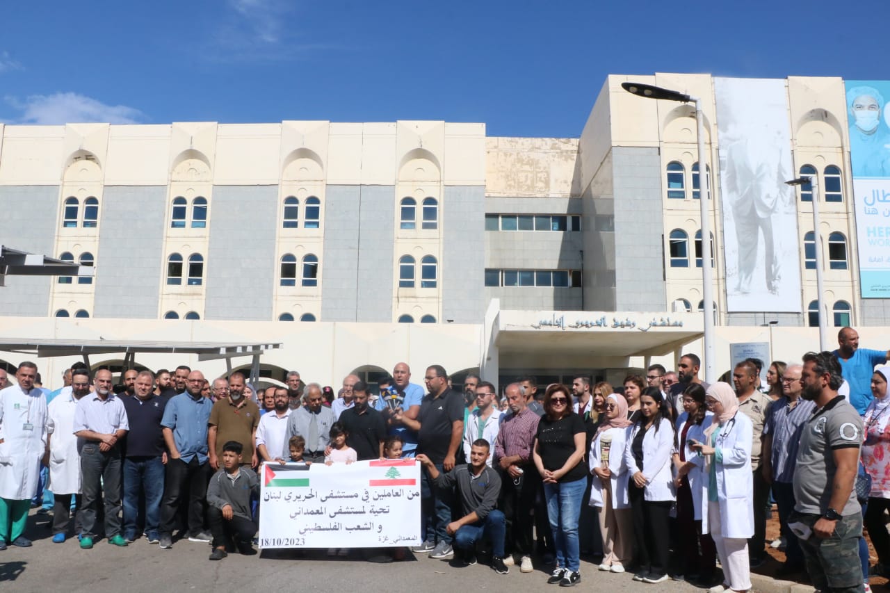 ونفّذ موظّفو مستشفى الحريري الحكومي وقفة تضامنية مع غزة، وتنديداً باستهداف المستشفى المعمداني.
