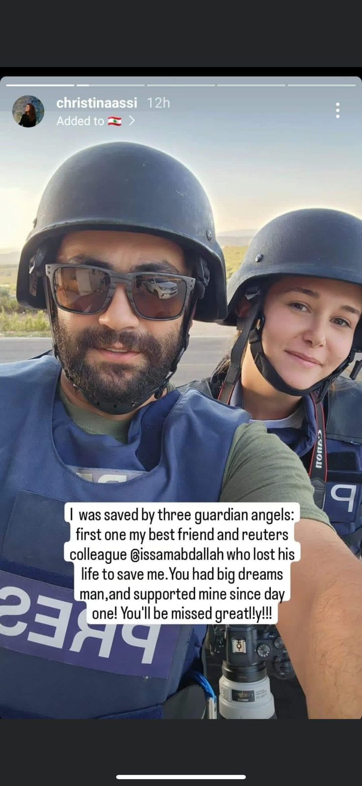 نشرت الصحافية كريستينا عاصي، التي تعرّضت لإصابة بليغة أثناء تغطية مستجدات الجنوب إثر قصف إسرائيلي استهدف السيارة التي كانت تتواجد فيها رفقة عدد من الصحافيين بينهم الشهيد عصام عبدالله، صورة لها ولعبدالله على خاصية الستوري، قالت فيها إن عبدالله أنقذ حياتها من الموت، وفقد حياته من أجل إنقاذها، مشيرةً إلى أنها ستفتقده.