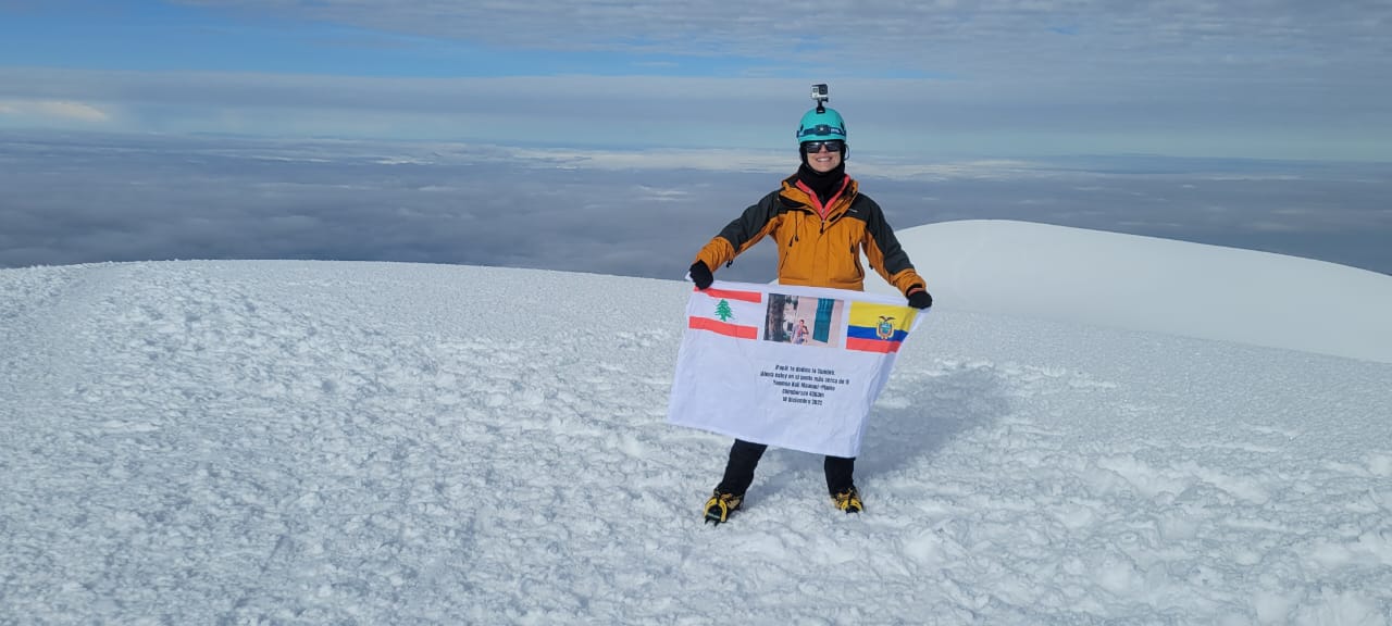 "أهديك القمة يا أبي، انا الآن في أقرب نقطة منك"، عبارة ذيلت بها يمنى الراية التي حملتها معها الى القمة، وقد طبعت عليها العلمين اللبناني والإكوادوريّ، تتوسطهما صورتها مع والدها الراحل، مؤرخة لإنجازها في 18 كانون الاول 2022.
