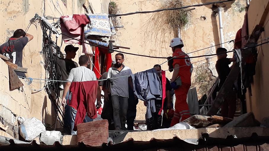 من مكان انهيار سقف المبنى في صيدا القديمة.