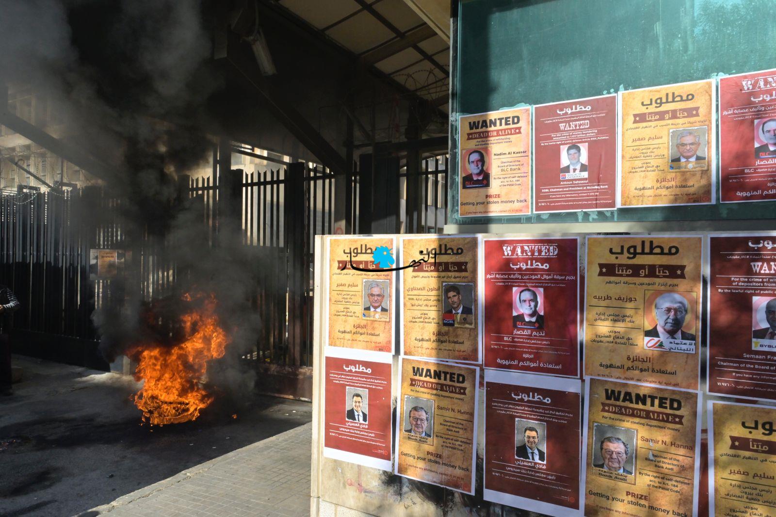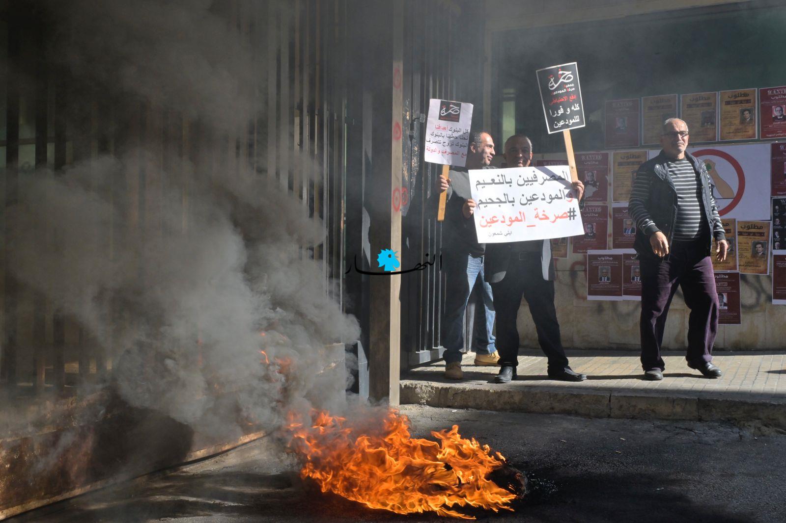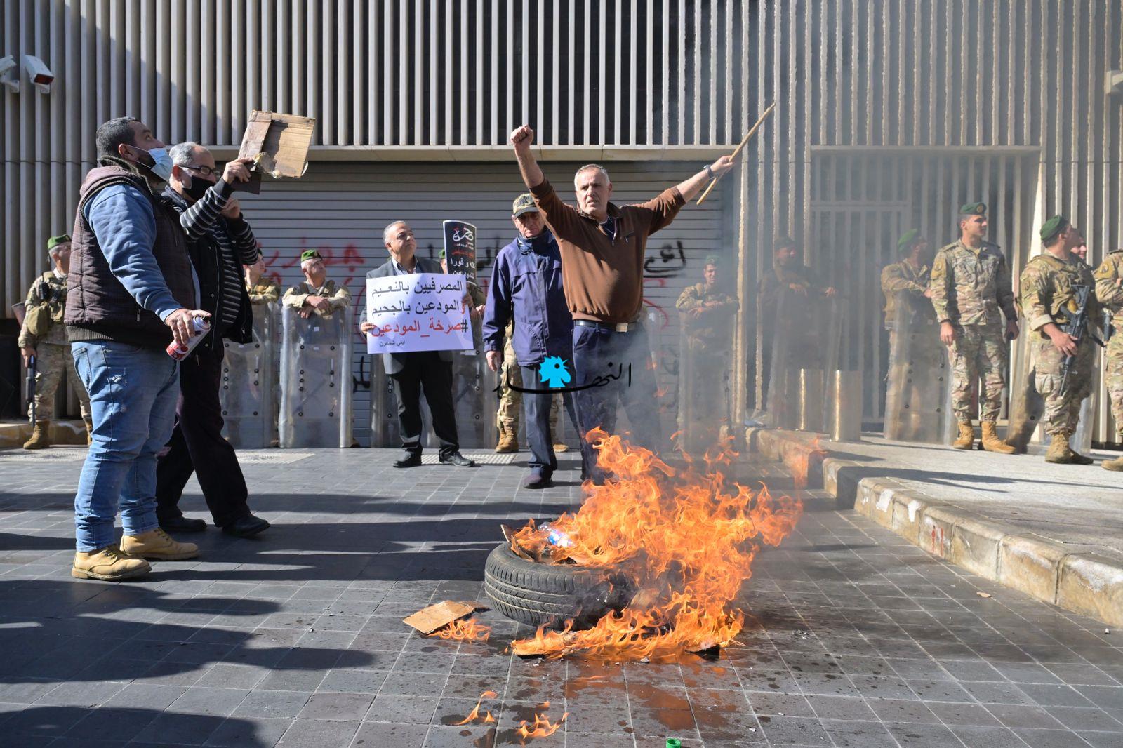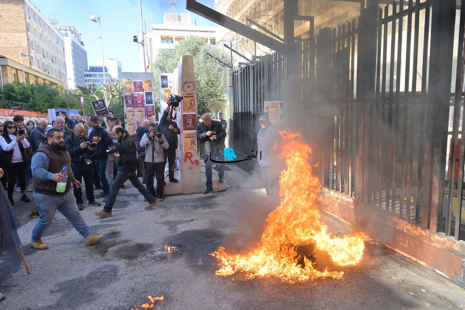 وعمد المعتصمون إلى إحراق الإطارات أمام مدخل المصرف، وقطع الطريق الرئيسية في شارع الحمراء.