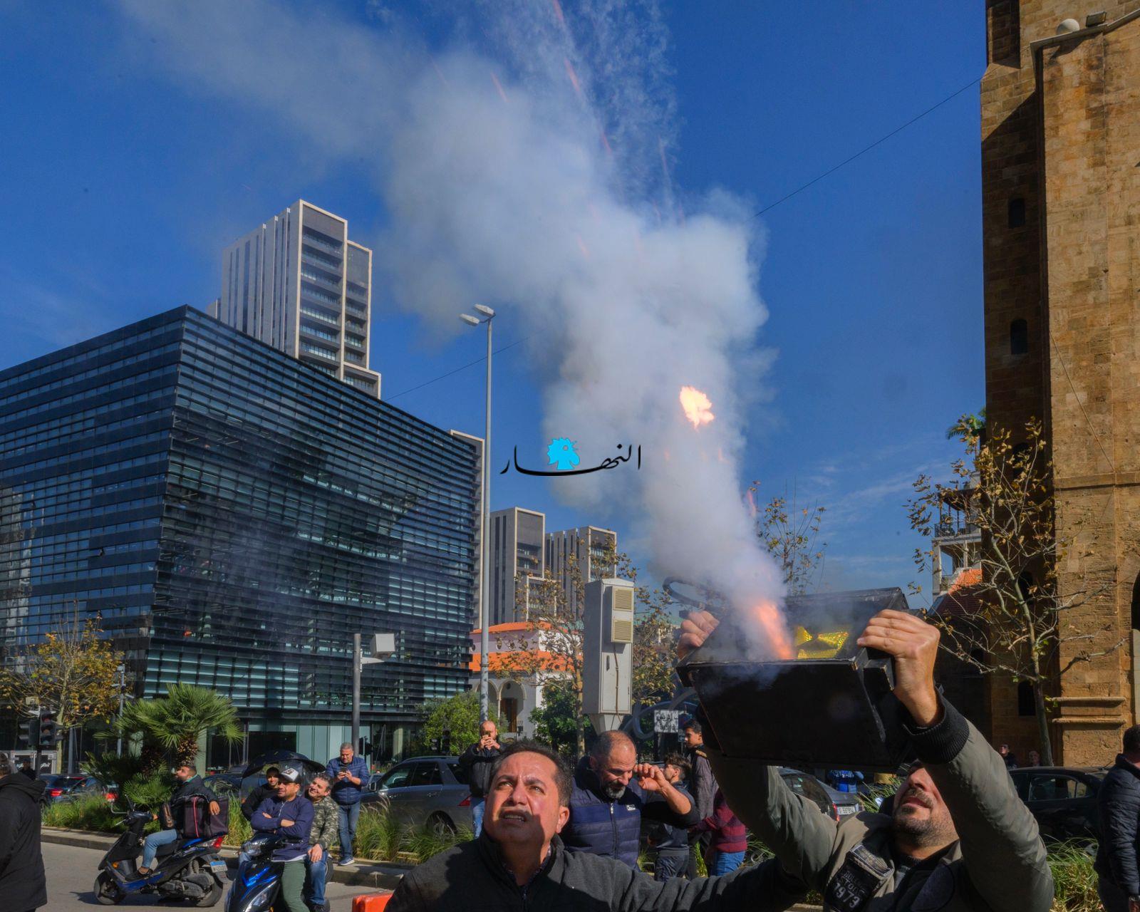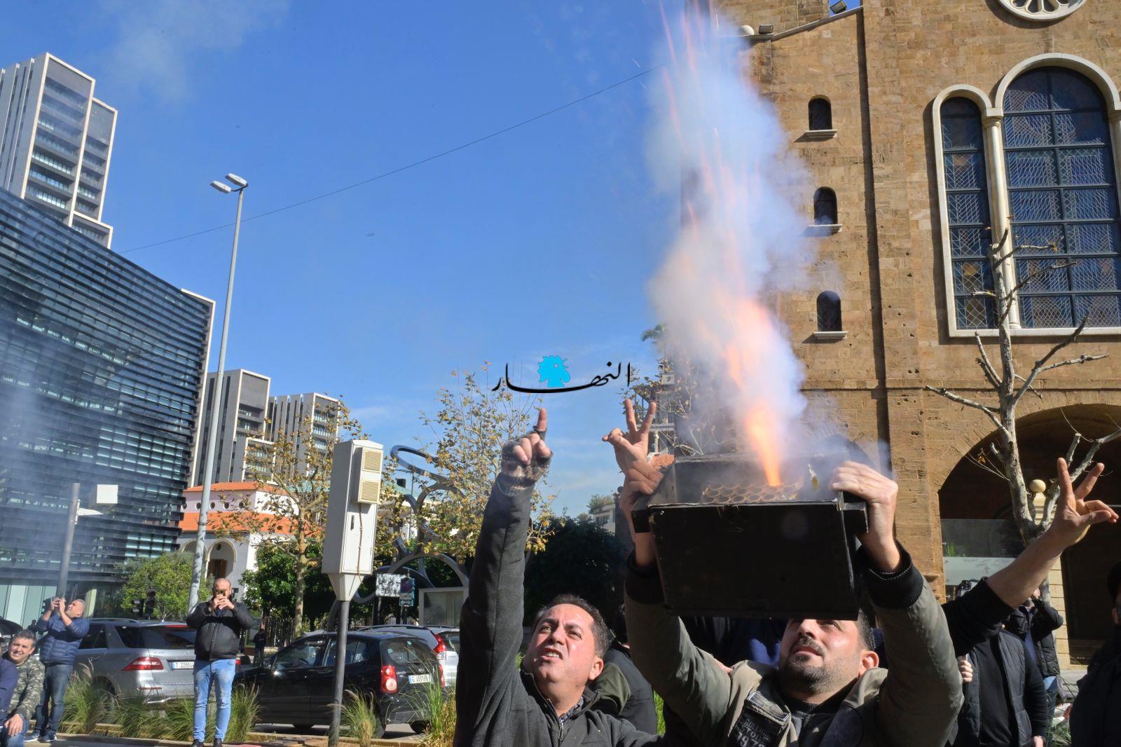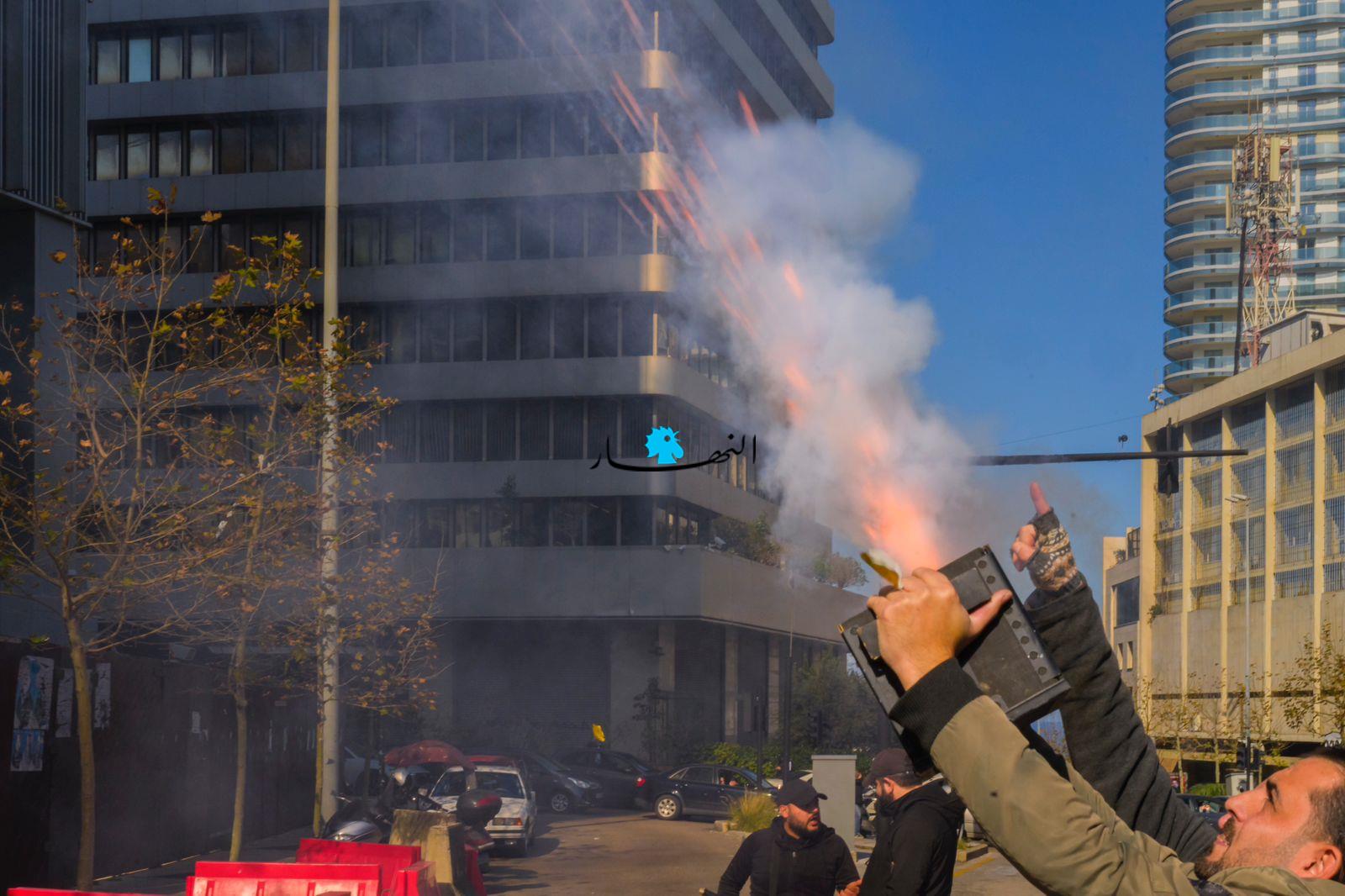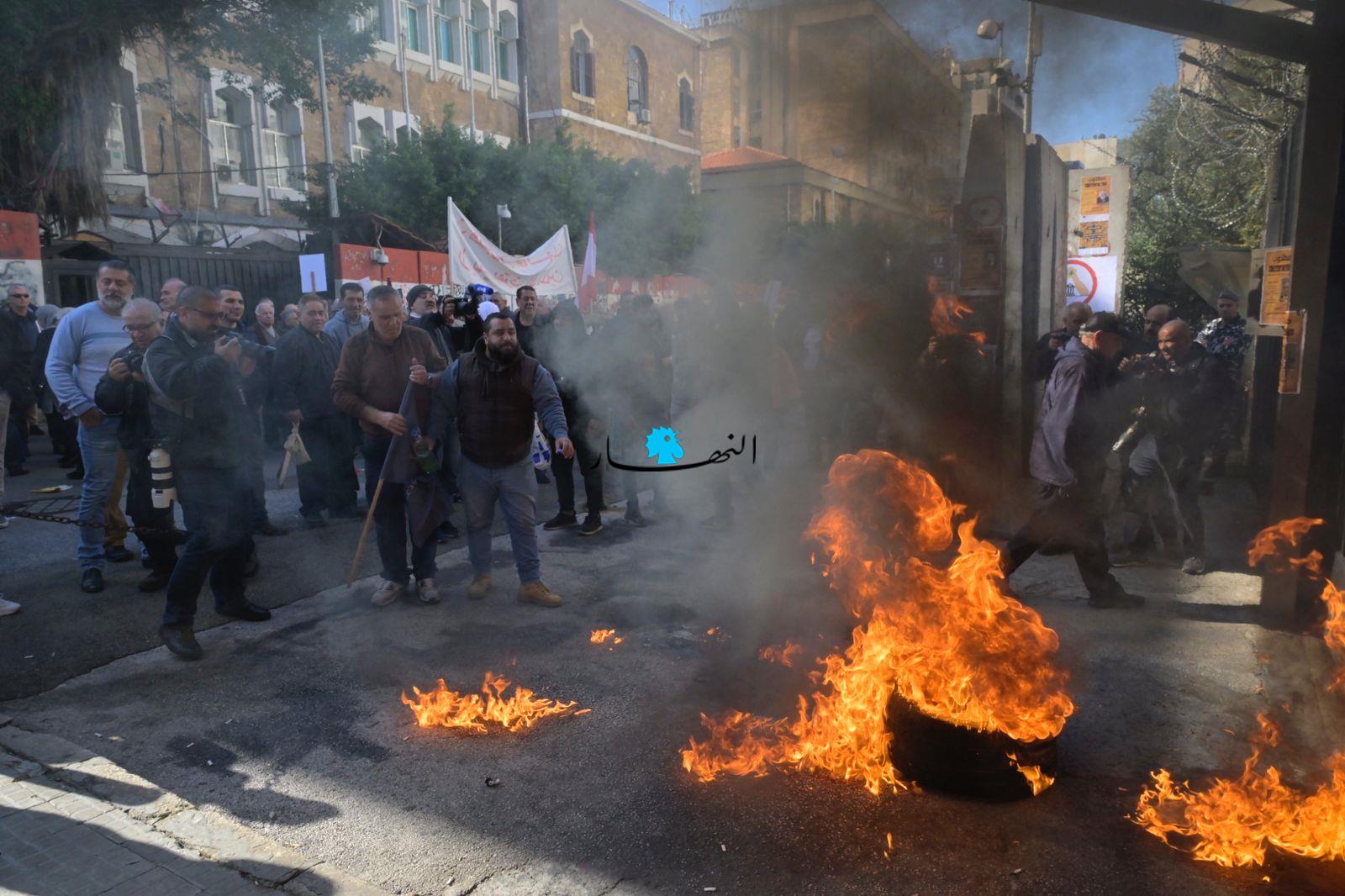 وعمد المعتصمون إلى إحراق الإطارات أمام مدخل المصرف، وقطع الطريق الرئيسية في شارع الحمراء.