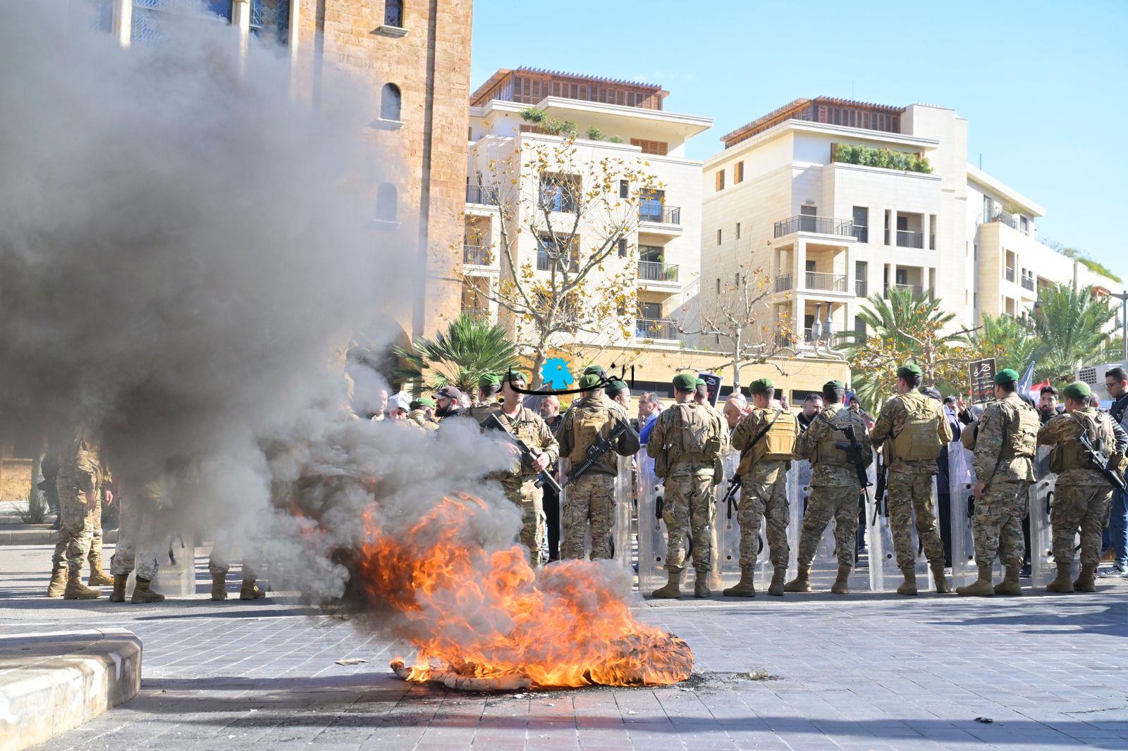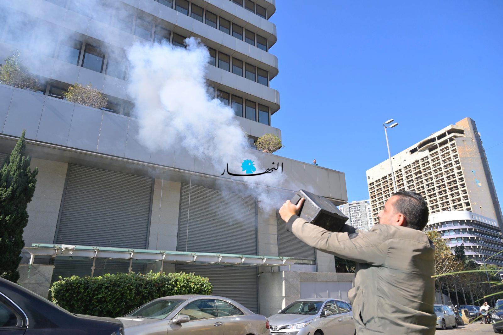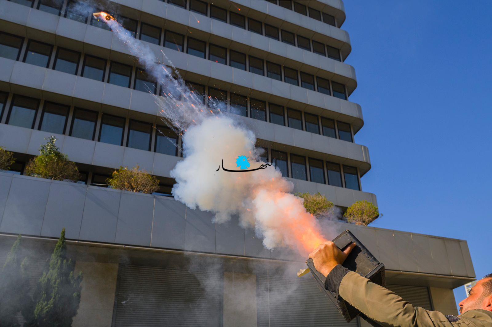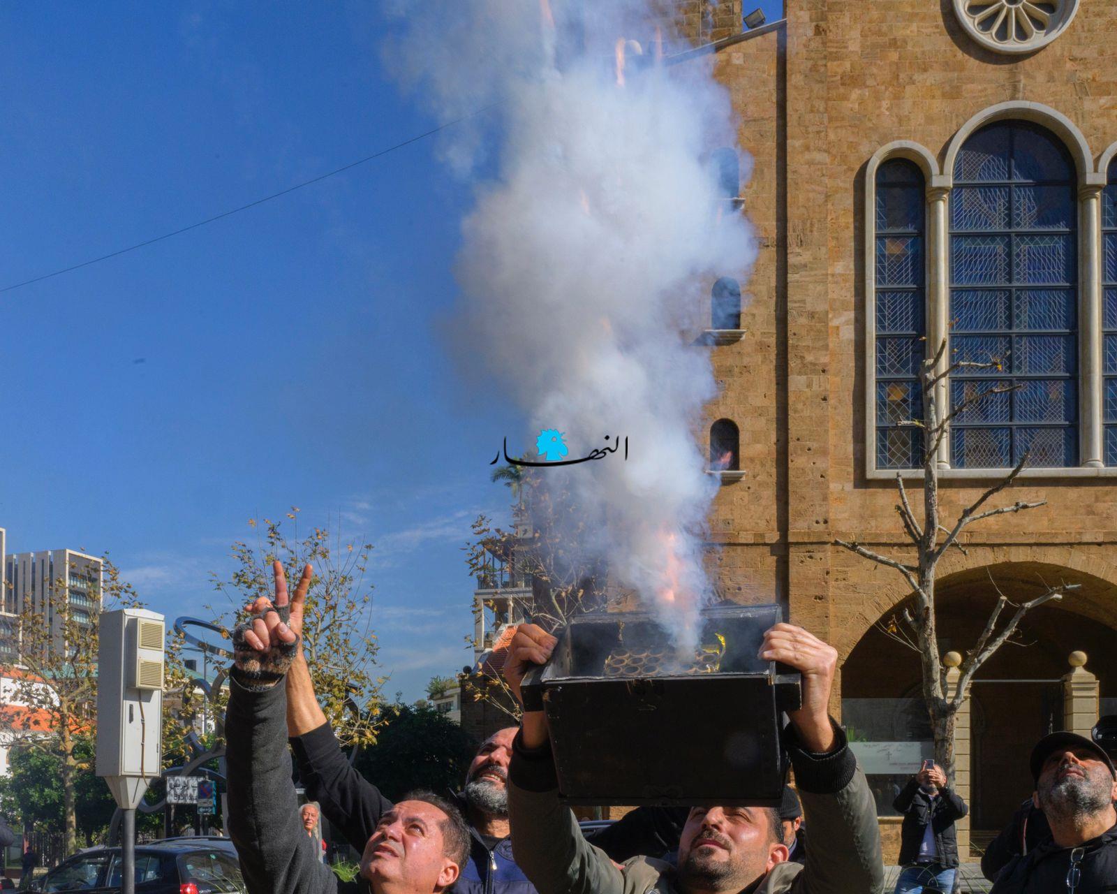 وعمد المعتصمون إلى إحراق الإطارات أمام مدخل المصرف، وقطع الطريق الرئيسية في شارع الحمراء.