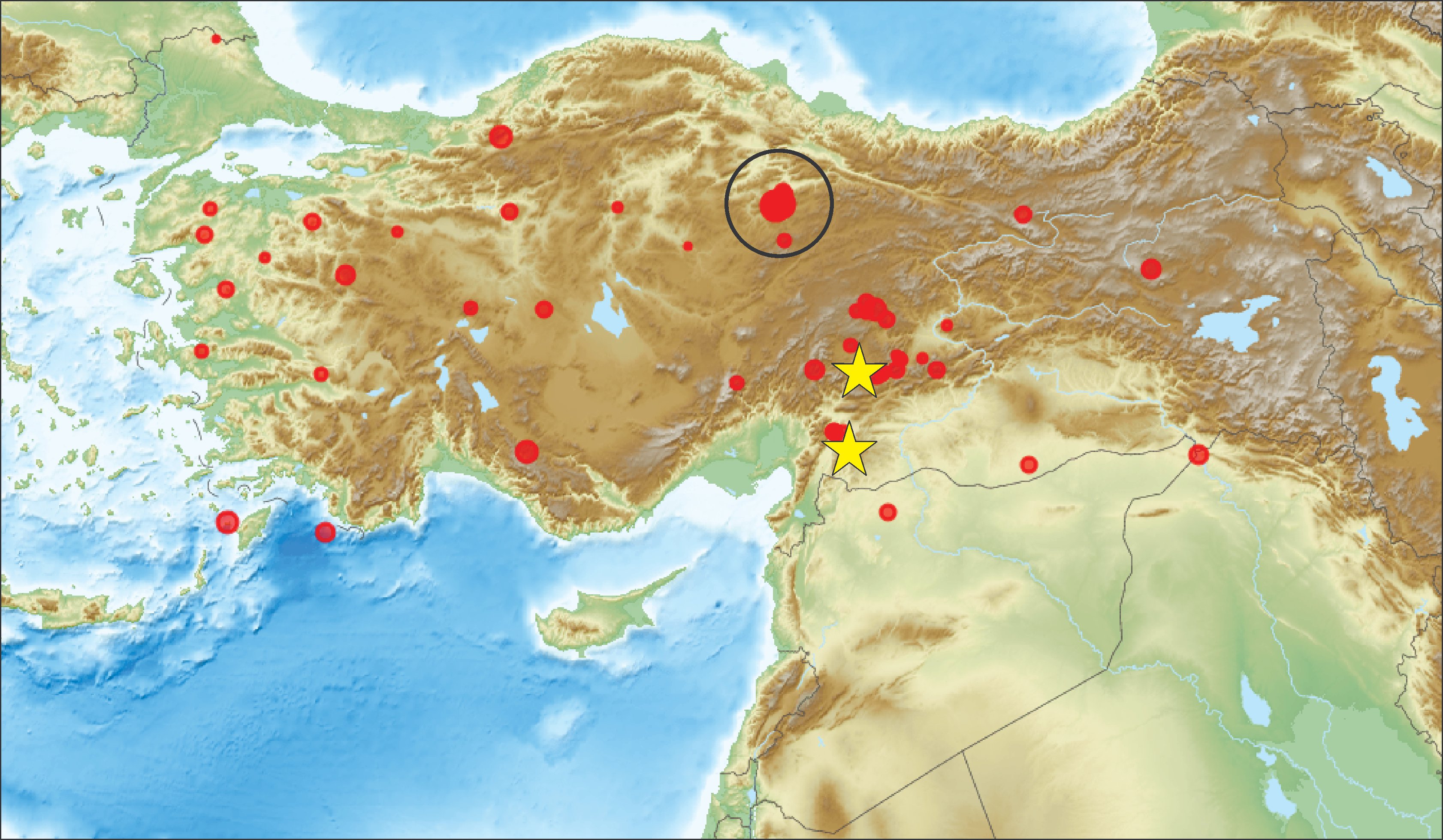 يُسارع نمر إلى طمأنة الناس، مدعماً قراءته بشرح لخريطة تظهر نقاط الارتكاز الزلزاليّة في تركيا خلال الأسبوع الحالي (الدوائر الحمراء) ونقطتي ارتكاز زلزالَي 6 شباط 2023 (النجوم الصفراء).