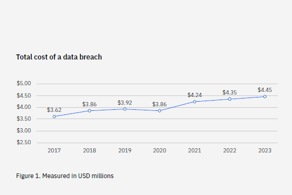 رسم بياني يوضح متوسط تسريب البيانات خلال السنوات الأخيرة (من تقرير IBM)
