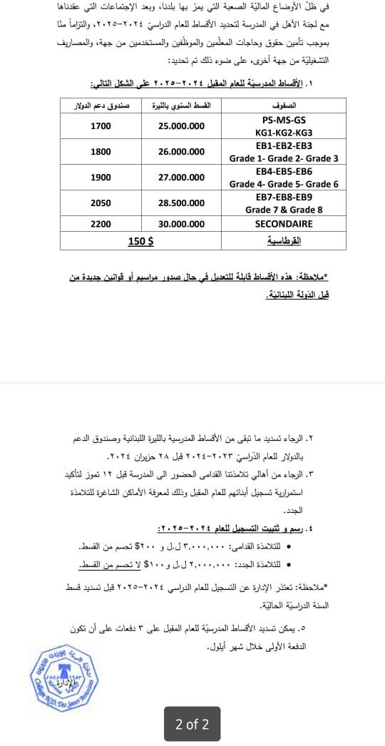 من جهته، أكّد رئيس لجنة الأهل في "الراهبات الأنطونيات"، المهندس ياسر شعيتاني، لـ"النهار" أنه "كرئيس لجنة أهل لن يكون إلا مع الأهالي لجهة مطالبهم. ولكن علينا النظر عميقاً قبل الاعتراض، مع العلم أن الموازنة تقرّها لجنة الأهل في بداية العام الدراسي ٢٠٢٥. وعلى هذا الأساس، بعد اطلاعنا على الأقساط المقترحة للعام الجديد من الإدارة، وحصول مناقشة متعمّقة، نجحنا في توفيق وجهات النظر بين متطلبات الأهل والمؤسّسة، وصولاً إلى القيمة المعلنة للأقساط، مع العلم أن الرئيسة كانت متجاوبة جداً لعلمها بوضع الأهالي والبلد معيشياً".