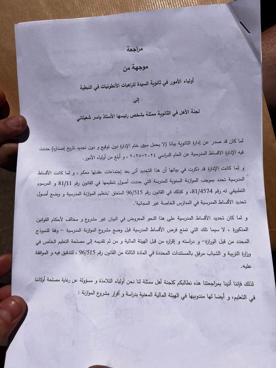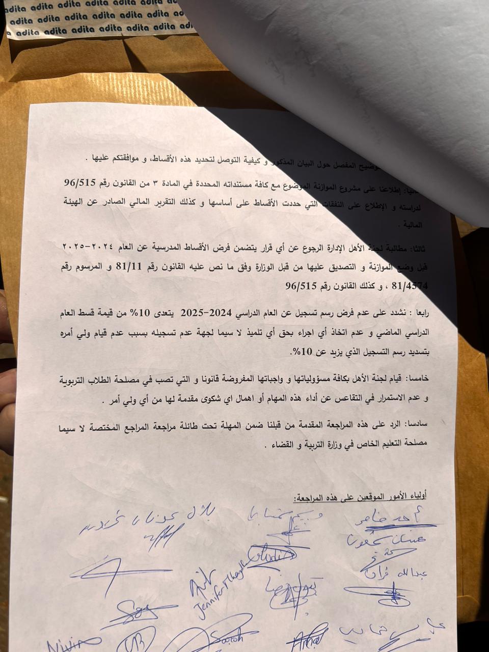 ورفع المحتجّون كتاباً موقعاً من الأهالي إلى لجنة الأهل يحمّلهم "مسوؤلية مخالفة قانون تحديد الأقساط وزيادتها، خلافاً للقانون المنظم للمدارس الخاصة، التي تُحدّد بـ١٠٪ وبالليرة فقط"، كما طالبوا "بمعرفة الموازنة السابقة التي على أساسها تمّ تحديد الموازنة المقترحة، لا سيّما لجهة الزيادة المحددة بالدولار"، مشددين على ضرورة معرفة أماكن صرفها، في "مهلة ١٥ يوم قبل التحرك قضائياً".