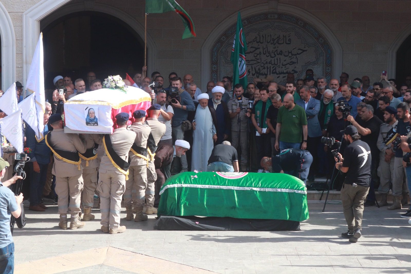وحُمل نعشا الفقيدتين على الأكفّ وصولاً إلى باحة حسينيّة البلدة، وسط هتافات.