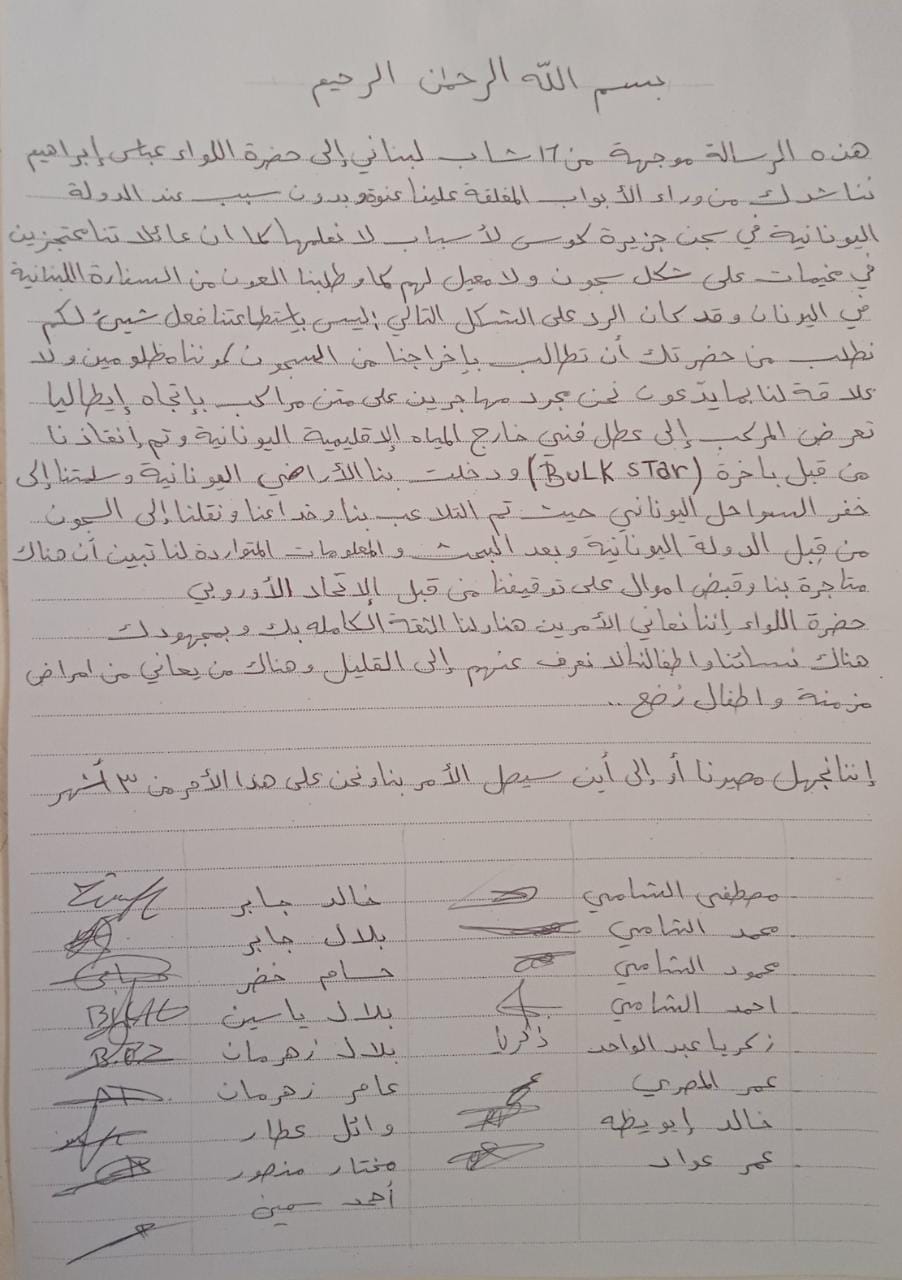 ويشار إلى أنّ 17 من المهاجرين غير الشرعيّين العالقين في اليونان كانوا قد وجّهوا رسالة موقّعة من قبلهم إلى مدير عام الأمن العامّ اللّواء عباس إبراهيم شارحين أوضاعهم وأوضاع عائلاتهم، وتمنّوا عليه حمل ملفّهم والتدخّل لدى السّلطات اليونانيّة للإفراج عنهم.