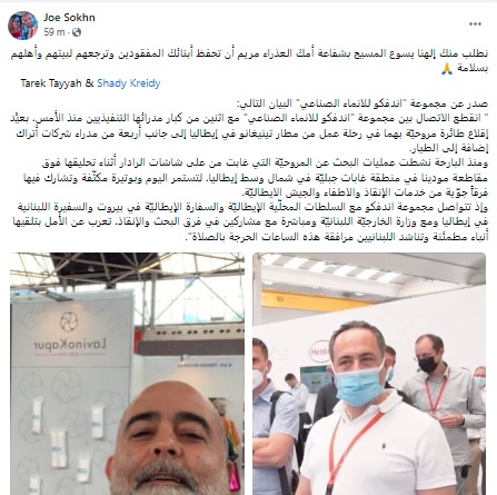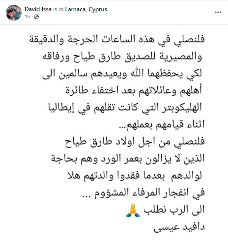 بعد شيوع خبر فقدان لبنانيَّين اثنَين كانا على متن المروحية التي اختفت في منطقة جبلية غير مأهولة في شمال إيطاليا، ومع استمرار عمليات البحث، توالت الدعوات والصلوات عبر مواقع التواصل لعودة اللبنانيين شادي كريدي وطارق طياح إلى عائلتيهما.