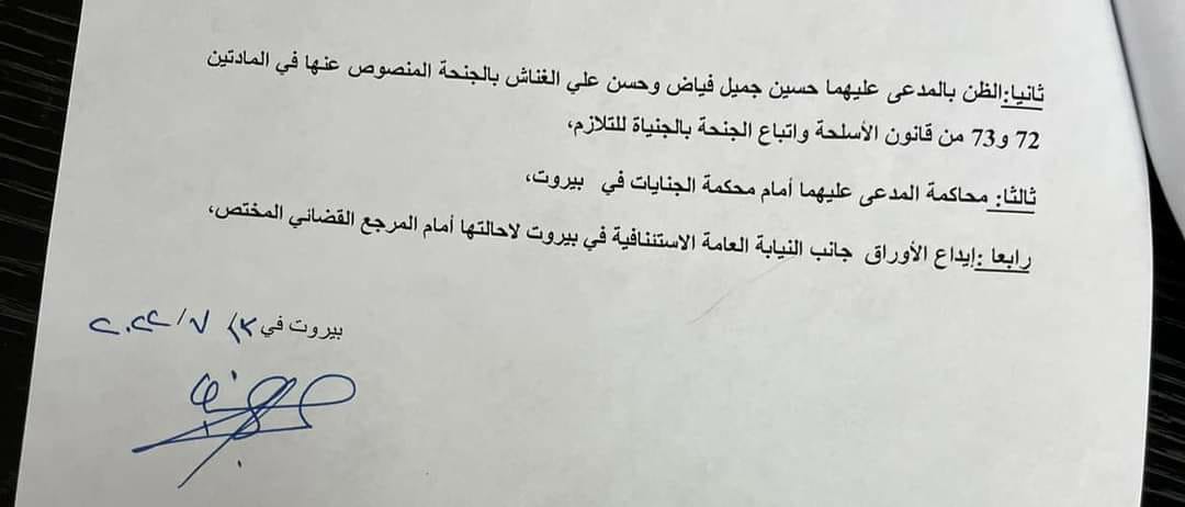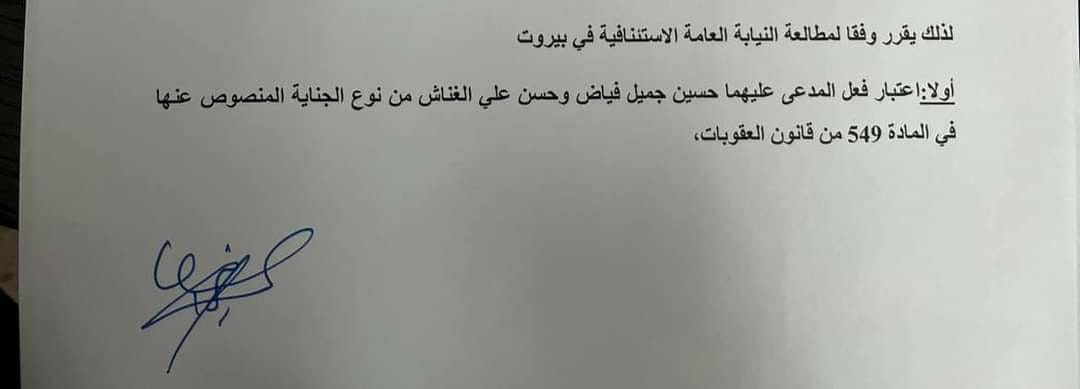 أصدر قاضي التحقيق الأول في بيروت شربل أبو سمرا القرار الظني باعتبار فعل المدعى عليهما بجريمة أنصار حسين فياض وحسن الغناش من نوع الجناية المنصوص عنها في المادة 549 من قانون العقوبات التي تقضي بإنزال عقوبة الإعدام.