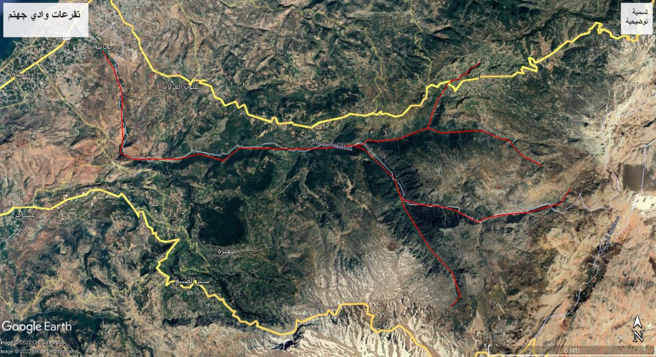التفرّع الأول يبدأ تقريباً من أعالي بلدة "القمامين" مُتاخماً لغابة أرز القلّة وجرد "مربيّن"، ويضمّ "وادي عميري" وبعض التفرّعات الصغيرة على ارتفاع 1800م عن سطح البحر، وهو يلتقي مع التفرّع الثاني من أعالي بلدة "مشمش"، حيث المنطقة المسمّاة بـ"باب وادي جهنم" على ارتفاع 1900م تقريباً عن سطح البحر، نزولاً عبر وادي "حقل الخربة"، ليلتقي التفرّعان حيث تجتمع مياه "نبع البرغش" بمياه "نبع الدلب" وبينهما عشرات الينابيع الصغيرة، فيكملا مسارهما حتى ملتقى النهرين، حيث يشكّلان معاً نهراً واحداً، وليكون الملتقى بين كلّ التفرّعات: تفرّع وادي الواطية، ووادي أبو زيد مع وادي مشمش، مع ما يحملانه من مياه نبع فنيدق وعشرات الينابيع الأخرى، ويستمرّ الوادي نزولاً حتى يتجاوز منطقة عيون السمك والبارد وصولاً حتى مشارف الساحل. وكلّ ما ذكرناه من تفرّعات ومياه منسابة فيه تُشكّل روافد لنهر البارد أحد أغزر الأنهار في عكار، والذي يصبّ في البحر بين مخيم نهر البارد ومدينة المنية".