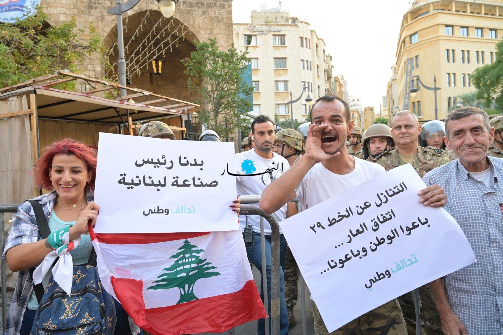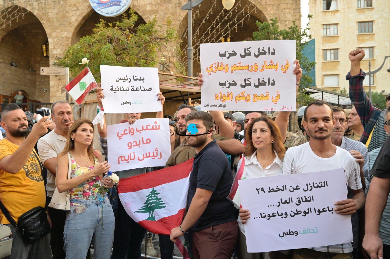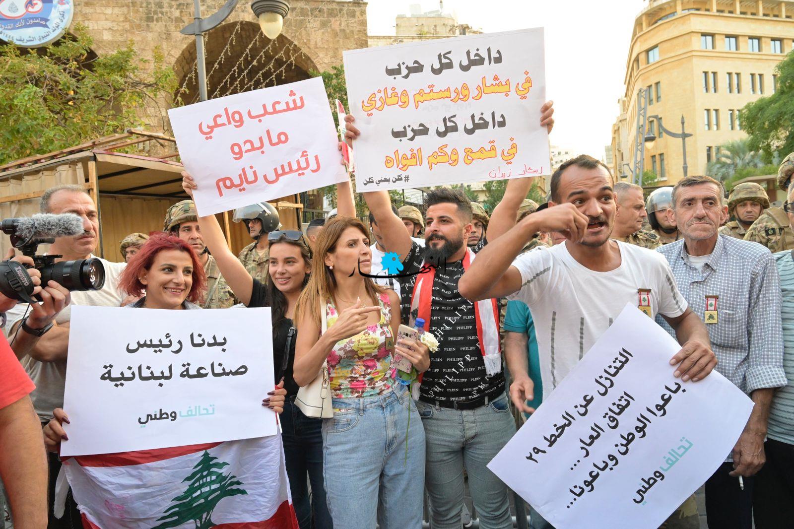 وحمل المشاركون لافتات كُتب عليها "بدّنا رئيس صناعة وطنية"، "رئيس من خارج المنظومة الفاسدة"، و"اتفاق العار... باعوا الغاز وباعونا" وغيرها.
