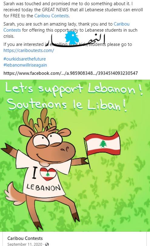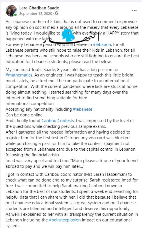 فتواصلت الوالدة مع المؤسسة عبر البريد شارحةً لها وضعها وشغفها لخوض ابنها المسابقة، فكانت المفاجأة انها تلقت بعيد تفجير مرفأ بيروت، بريداً إلكترونياً من المؤسسة، يبلغها أنّ ابنها عماد وأيّ طالب لبناني آخر يمكنه أن يخوض المسابقة مجّاناً كمبادرة منهم لتشجيع الطلّاب اللّبنانيّين وحثّهم على التعلّم والمثابرة.