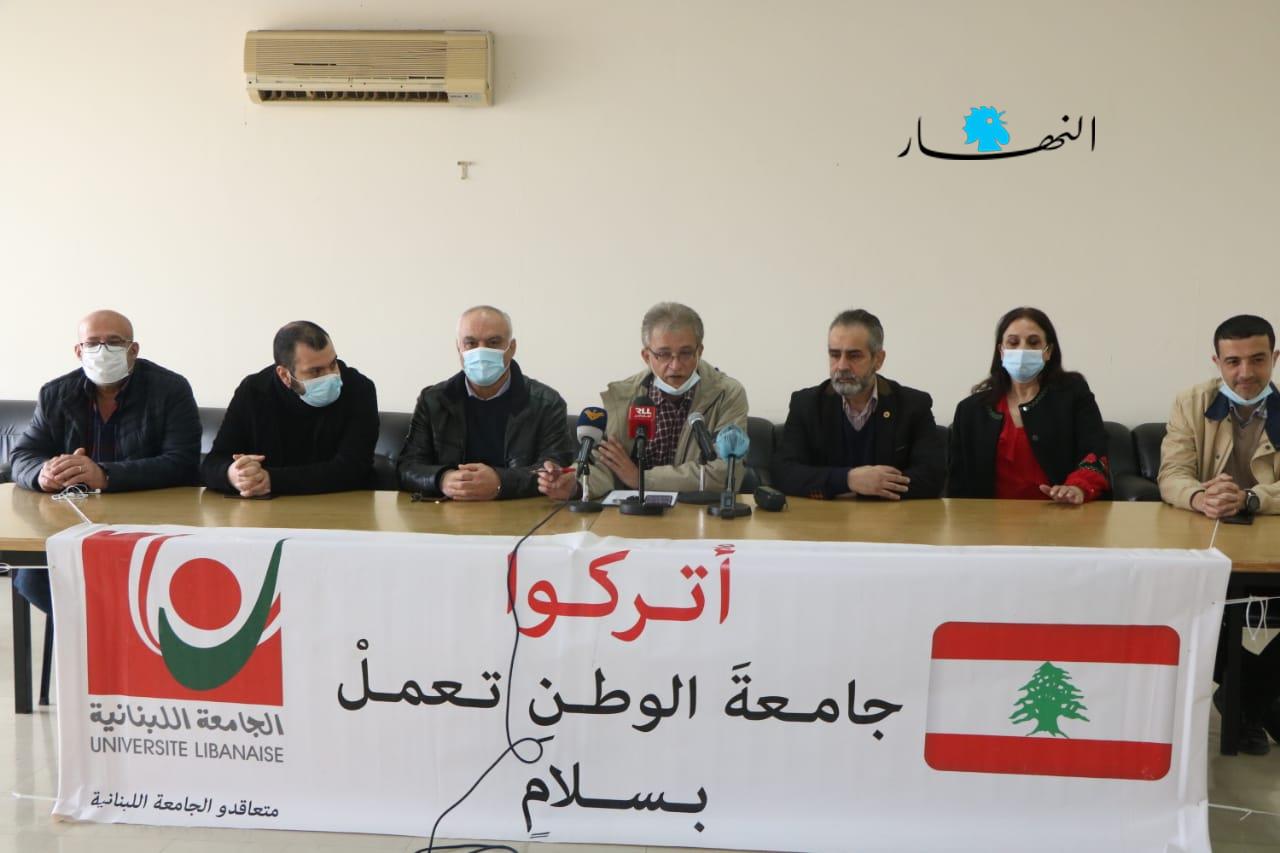 عقدت اللجنة التمثيلية للأساتذة المتعاقدين بالساعة في الجامعة اللبنانية مؤتمراً صحافياً في مجمّع الحدت الجامعي، مبنى كلية العلوم، وأصدرت بياناً تلاه الدكتور حامد حامد، الذي قال: "أيها الزملاء الأعزاء، منذ مدة، والجامعة اللبنانية الوطنية تتعرّض لأزمة وجودية كبرى تصلّ إلى حدود الكارثة الوطنية، إذ تمّ تصنيفها خارج إطار الأولويات بالنسبة إلى الحكومة، التي تعقد جلسات خاصة للكهرباء والنفايات والاتصالات وغيرها من القضايا الخدماتية والمعيشية المطلوبة على مستوى المادة، في حين أنها تجاوزت وأهملت قضايا العقل والمعرفة والإبداع عن سابق تصور وتصميم".