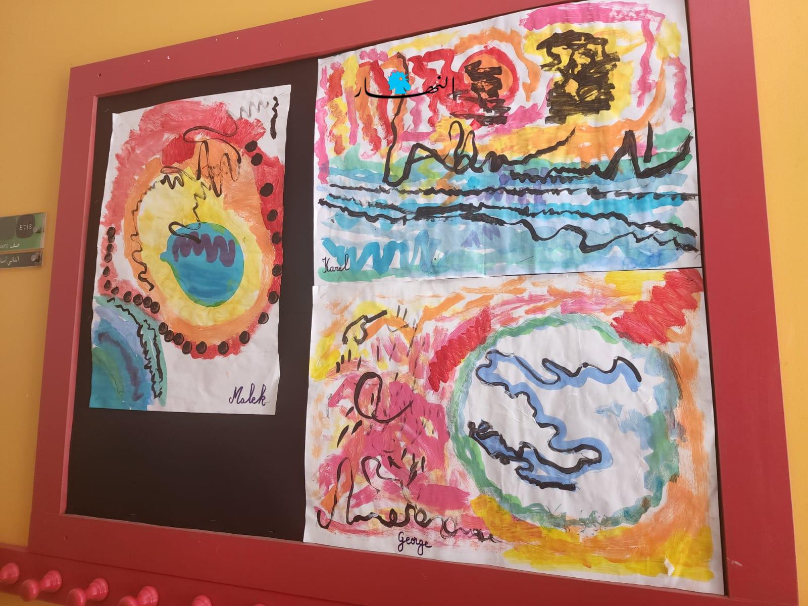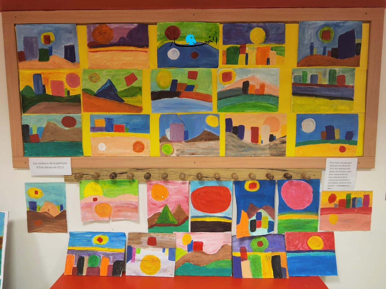 واستخدم الطلّاب الألوان الصّلبة لرسم مساحات مسطحة من المناظر الطبيعية بالألوان زاهية ورسومات مستوحاة من الفنانة ايتل عدنان.
