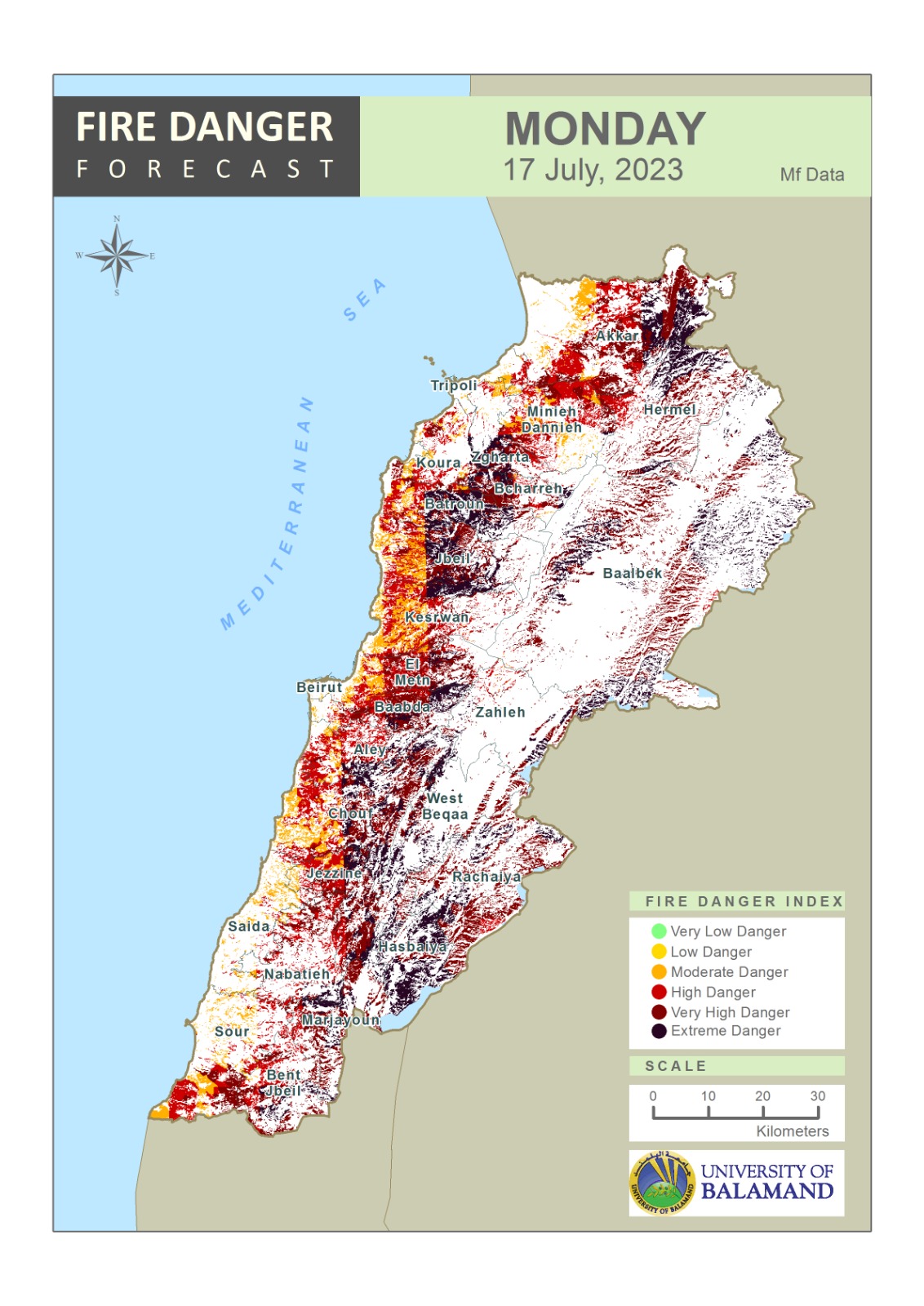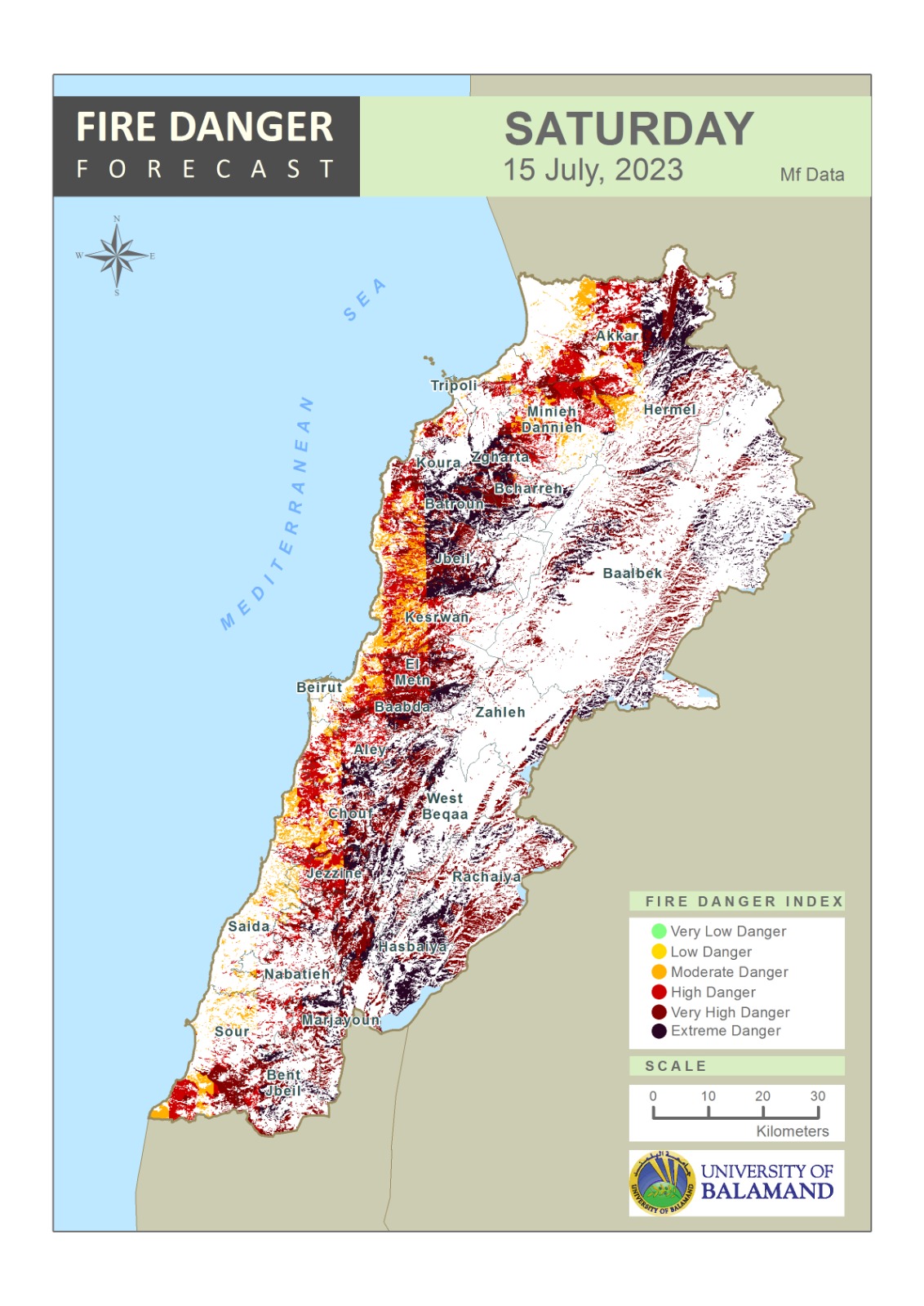 نشرت وزارة البيئة 3 خرائط تظهر المناطق الأكثر عرضة للحرائق أيام السبت والأحد والاثنين، معلنةً أنّ "لبنان يتعرّض، كسائر البلدان في المنطقة، إلى موجة طقس حارة وناشفة قد تمتدّ في الأيام المقبلة مما يفاقم أكثر خطر اندلاع الحرائق في غابات لبنان والأراضي العشبية والزراعية، وبناءً على ذلك".