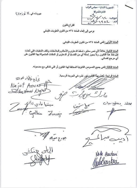 - وقّعت منذ أشهر مع نوّاب آخرين على اقتراح قانون يلغي المادة 534 من قانون العقوبات التي تعاقب بالحبس سنة كلّ من يرتكب جرم المجامعة على خلاف الطبيعة.