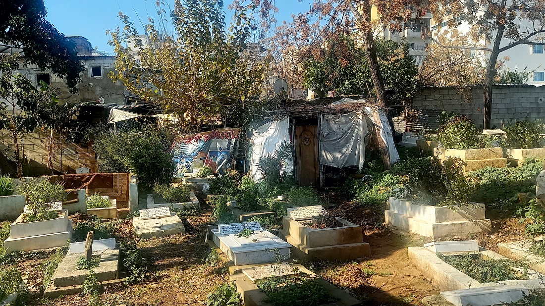 مساكن الصفائح المنتشرة في مقبرة الغرباء.